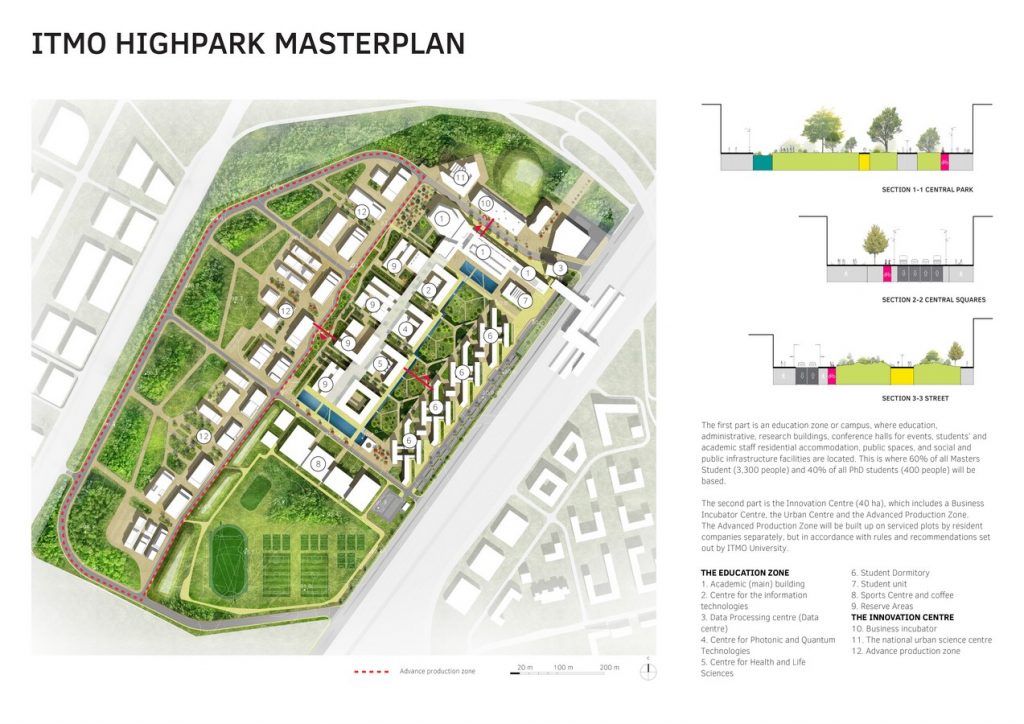 The second part is the Innovation Centre (40 ha), which includes a Business Incubator Centre, the Urban Centre and the Advanced Production Zone. The Advanced Production Zone will be built up on serviced plots by resident companies separately, but in accordance with rules and recommendations set out by ITMO University.