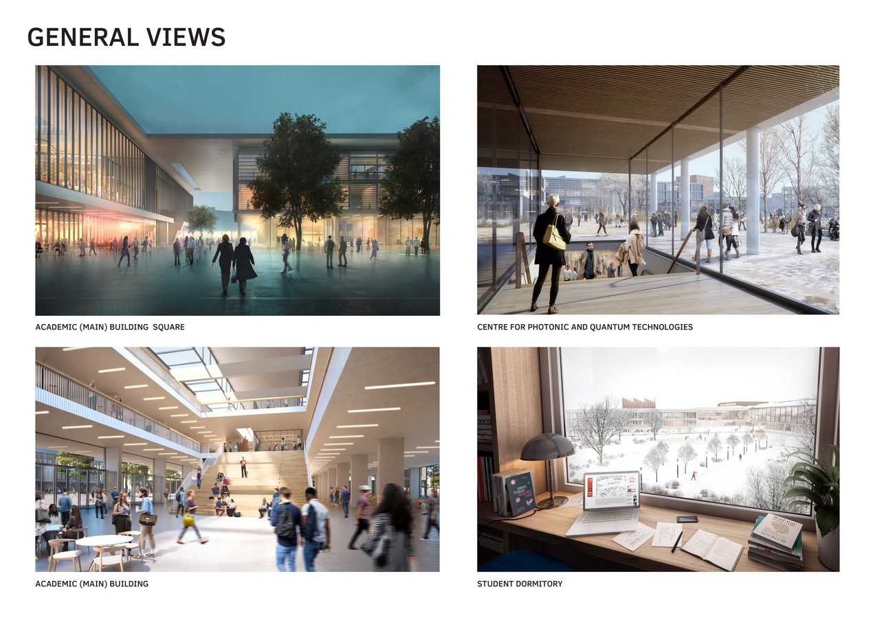 The first part is an education zone or campus, where education, administrative, research buildings, conference halls for events, students’ and academic staff residential accommodation, public spaces, and social and public infrastructure facilities are located. This is where 60% of all Masters Student (3,300 people) and 40% of all PhD students (400 people) will be based.
