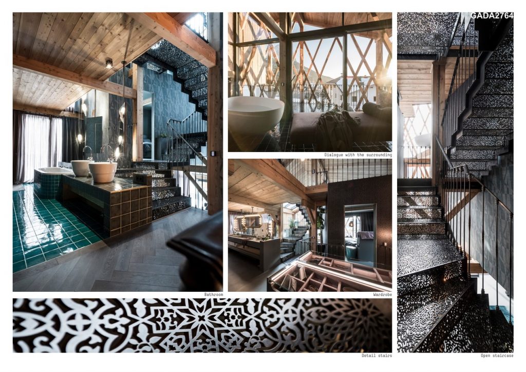 The house mirrors the construction type of the location’s rural buildings. On the stone foundation, is a wooden structure in larch on three levels, and which supports the gable roof, typical of the village’s dwellings. A wooden trellis covers the whole house in a shell-like manner, screening the light and heat of the sun in the hotter periods, and as a whole it is suggestive of the typical structures of alpine barns. Two boxes, one in bronze and one a glass structure ‘peak out’ from the trellis, to the north and south respectively, and so revealing to the exterior that there is something complex to the interior layout. To the south there is a glass facade and a terrace which opens out to the magnificent view over the landscape of the Dolomites, a view which is dominated by the splendid sight of the Sciliar massif.