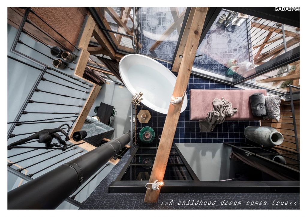 Inside the house, the distribution of spaces and functions is really unusual. The “boxes” which house the three bedrooms are supported by the wooden beam structure, visible in its totality. The bedrooms are designed as micro-homes, each one having its own particular design, these boxes seem to almost “hang” in the ample volume of the interior. One gains access via a staircase and a walkway system, which as well as having a connecting function, accommodate the “bathroom” areas with tubs and showers. On the final level, a glass box plays host to the sauna, extending out of the southern front: the sauna has great views out and in the book-lounge preceding the sauna, the antique majolica stove has been taken from the pre-existing building and installed. A cloakroom area and a library complete the private spaces on the higher levels.