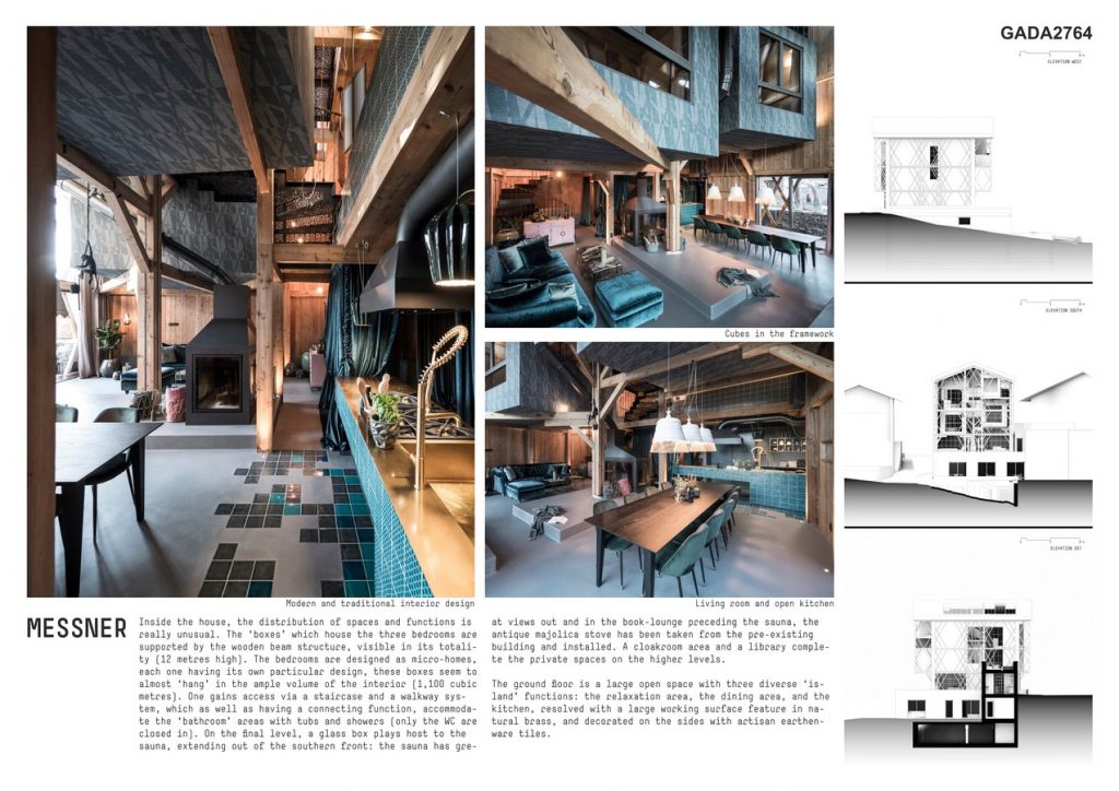 The house is softly implemented in the cluster and the historic appearance of the village. The typical farmhouses of the area consist of a base in stone and a wooden timber frame structure that forms the stable above were the inspiration for the design of the Messner Haus: The lower part is created of a massive volume with plastering on which a three storey high timber structure is sitting. Window openings are positioned selectively on five parts of the building and claim the dialogue with the surrounding. From the roof terrace, you have a stunning view of the mountain scenery.