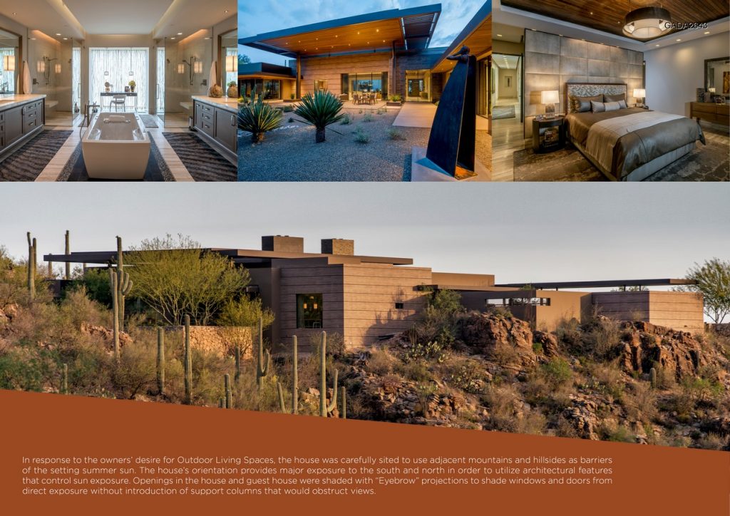 In response to the owners’ desire for Outdoor Living Spaces, the house was carefully sited to use adjacent mountains and hillsides as barriers of the setting summer sun. The house’s orientation provides major exposure to the south and north in order to utilize architectural features that control sun exposure. Openings in the house and guest house were shaded with “Eyebrow” projections to shade windows and doors from direct exposure without introduction of support columns that would obstruct views.