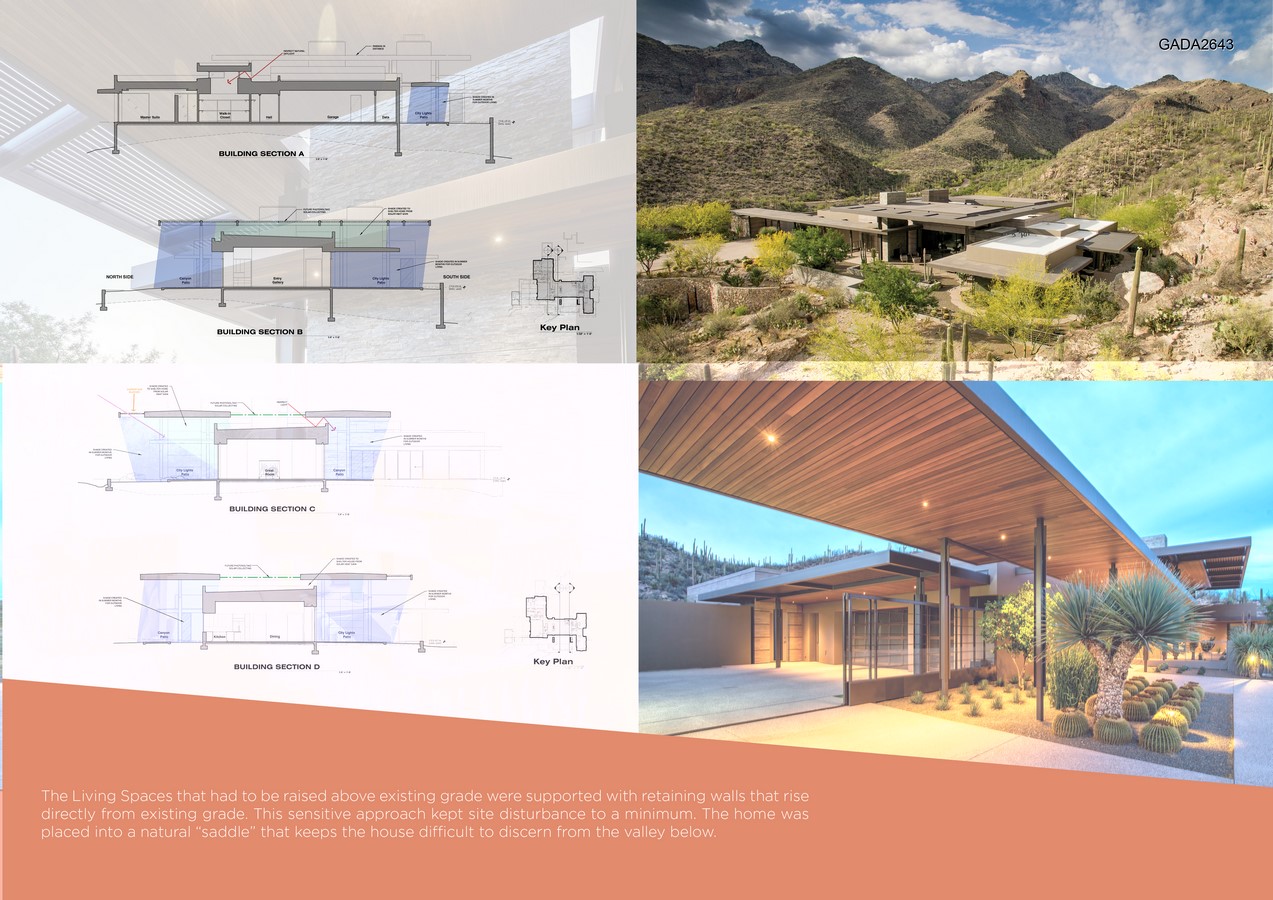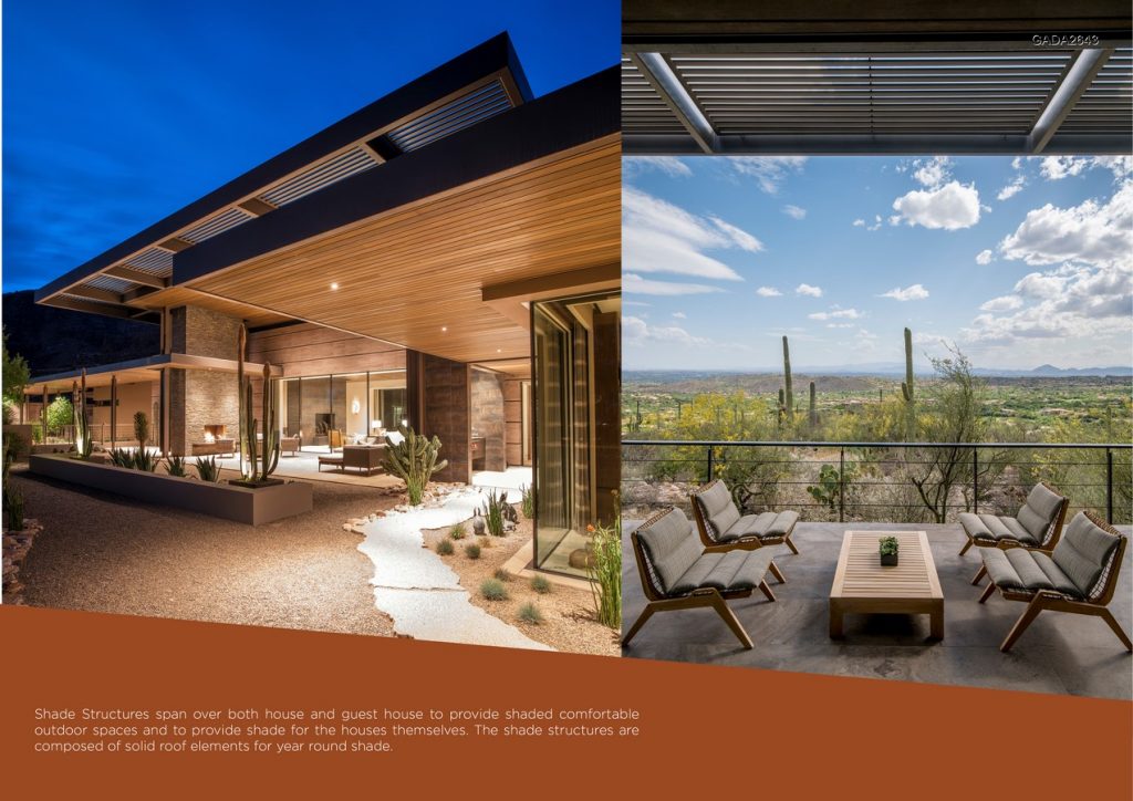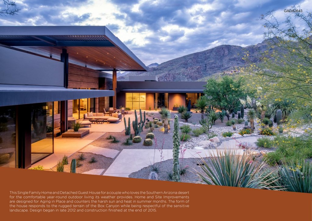 The Shaded House is a Single Family Home and Detached Guest House for a couple who loves the Southern Arizona desert for the comfortable year-round outdoor living its weather provides. Home and Site Improvements are designed for Aging in Place and counters the harsh sun and heat in summer months. The form of the house responds to the rugged terrain of the Box Canyon while being respectful of the sensitive landscape. Design began in late 2012 and construction finished at the end of 2015.