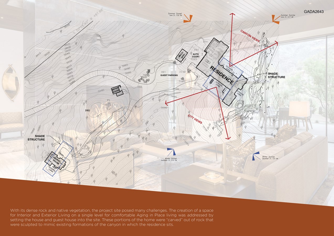 With its dense rock and native vegetation, the project site posed many challenges. The creation of a space for Interior and Exterior Living on a single level for comfortable Aging in Place living was addressed by setting the house and guest house into the site. These portions of the home were “carved” out of rock that were sculpted to mimic existing formations of the canyon in which the residence sits. The Living Spaces that had to be raised above existing grade were supported with retaining walls that rise directly from existing grade. This sensitive approach kept site disturbance to a minimum. The home was placed into a natural “saddle” that keeps the house difficult to discern from the valley below.