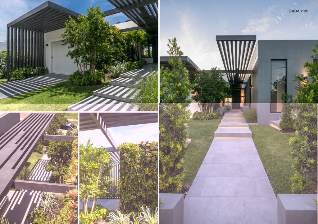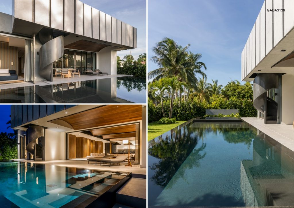 A sequence of courtyards interrelate each of the spaces from front to back, creating a straight path that moves you from the entry towards the boat dock. One single corridor takes you through all the areas, from entry courtyards with green walls, to cantilever pergolas, interior sculpture courtyard, to the main vaulted ceiling living area which opens up to an infinity pool and sculptural staircase leading to a roof deck.