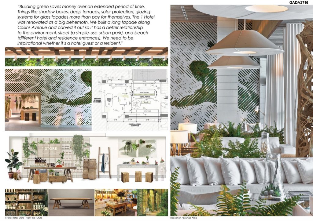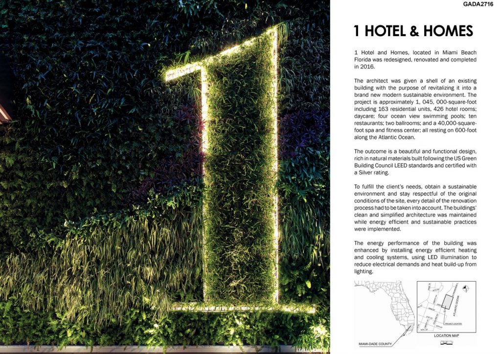 1 Hotel and Homes, locate in Miami Beach Florida was redesigned, renovated and completed in 2016.The architect was given a shell of an existing building with the purpose of revitalizing it into a brand new modern sustainable environment.