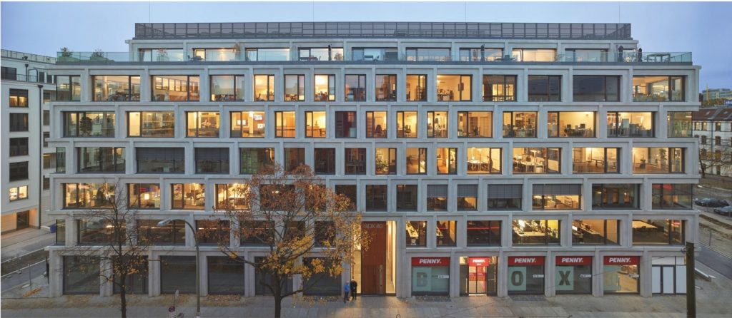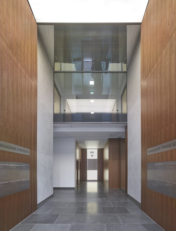 The building fits the modern demands on cavity floors, chilled ceilings and mechanical ventilation. As the Boxhagener Straße has a lot of traffic the ventilation is ensured by an autonomous system, which doesn’t require opening the triple glazed windows. The building is completely handicapped accessible.