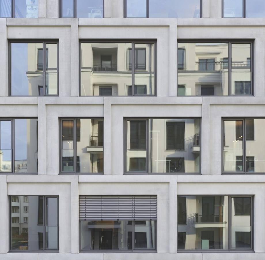 As a large-size volume with a dynamic concrete façade the office building on the Boxhagener Straße has a symbolic character and attracts attention of the passersby. Made of bright architectural concrete the prefabricated parts of the façade build a vibrant structure which at the same time remains clear and transparent.