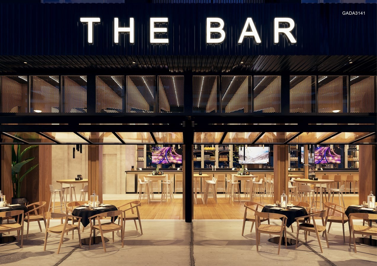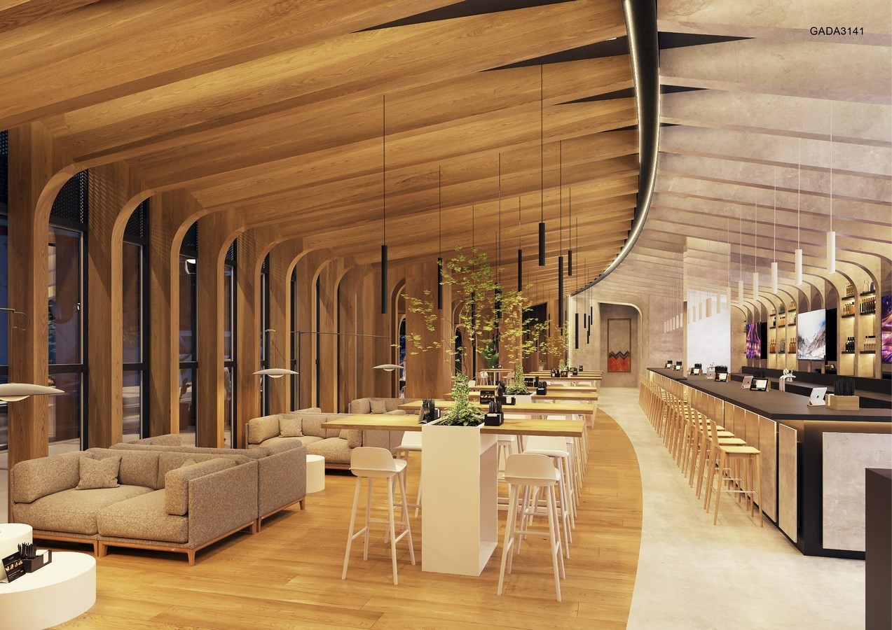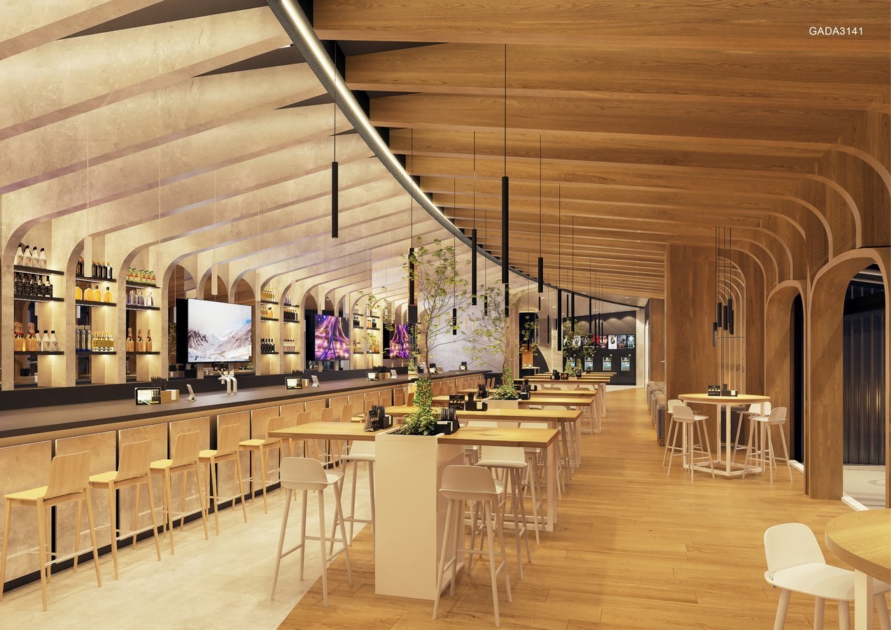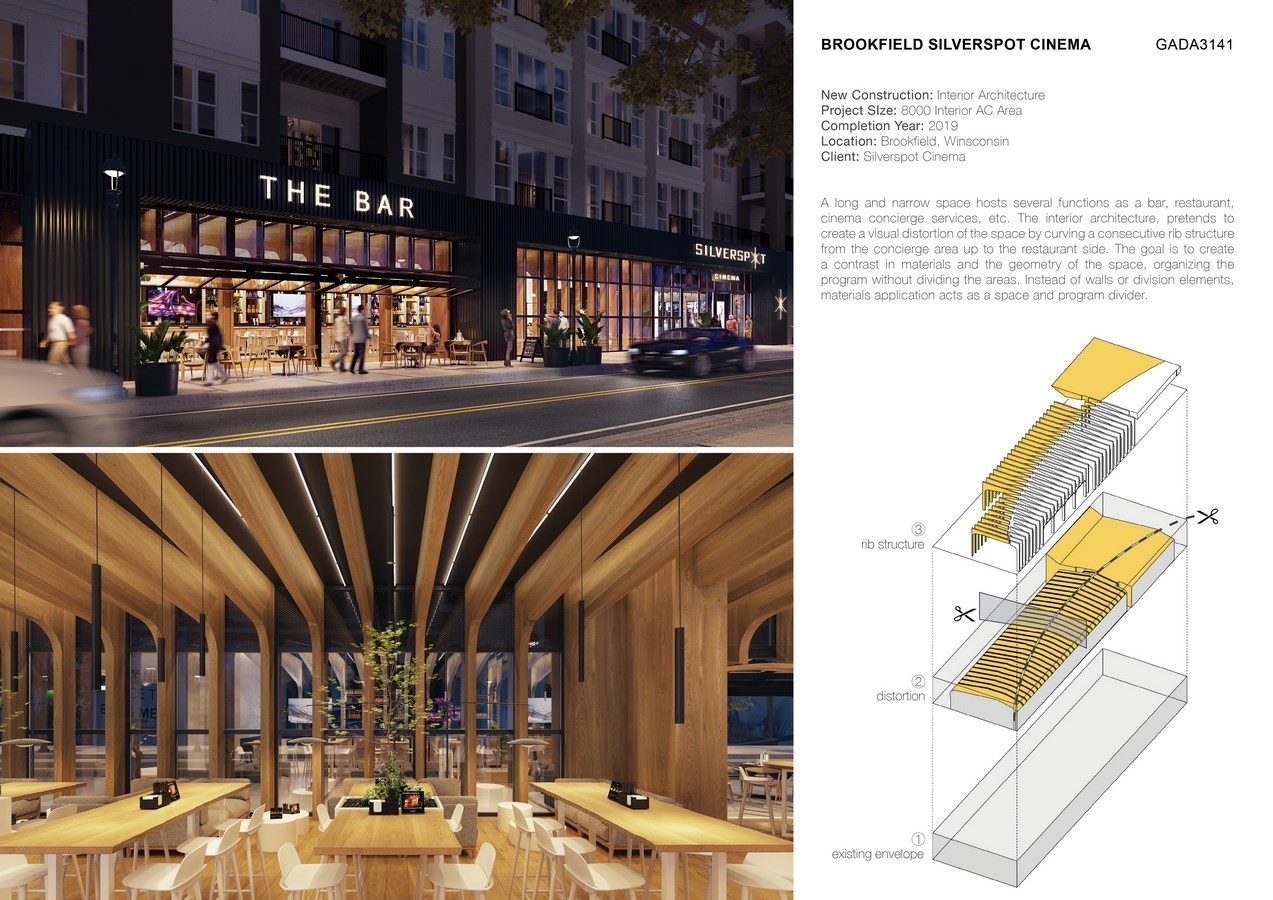 A long and narrow space hosts several functions as a bar, restaurant, cinema concierge services, etc. The interior architecture, pretends to create a visual distortion of the space by curving a consecutive rib structure from the concierge area up to the restaurant side.