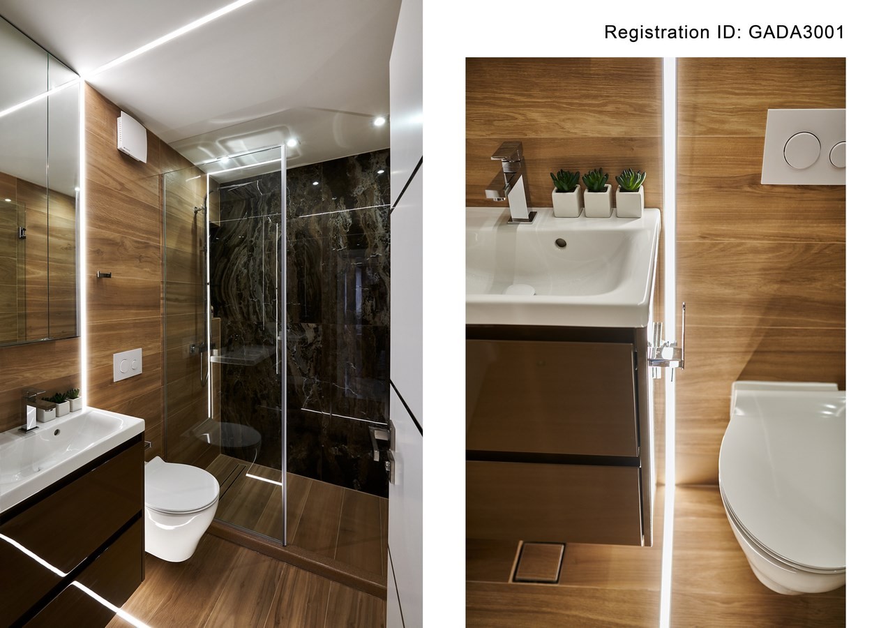 In the more spacious bathroom, we have a moisture-resistant profile with a diode tape that passes through the ceiling, wall and floor. This creates an attractive detail in the interior that stands out very well against the backdrop of the dark colors of the floor and wall lining.