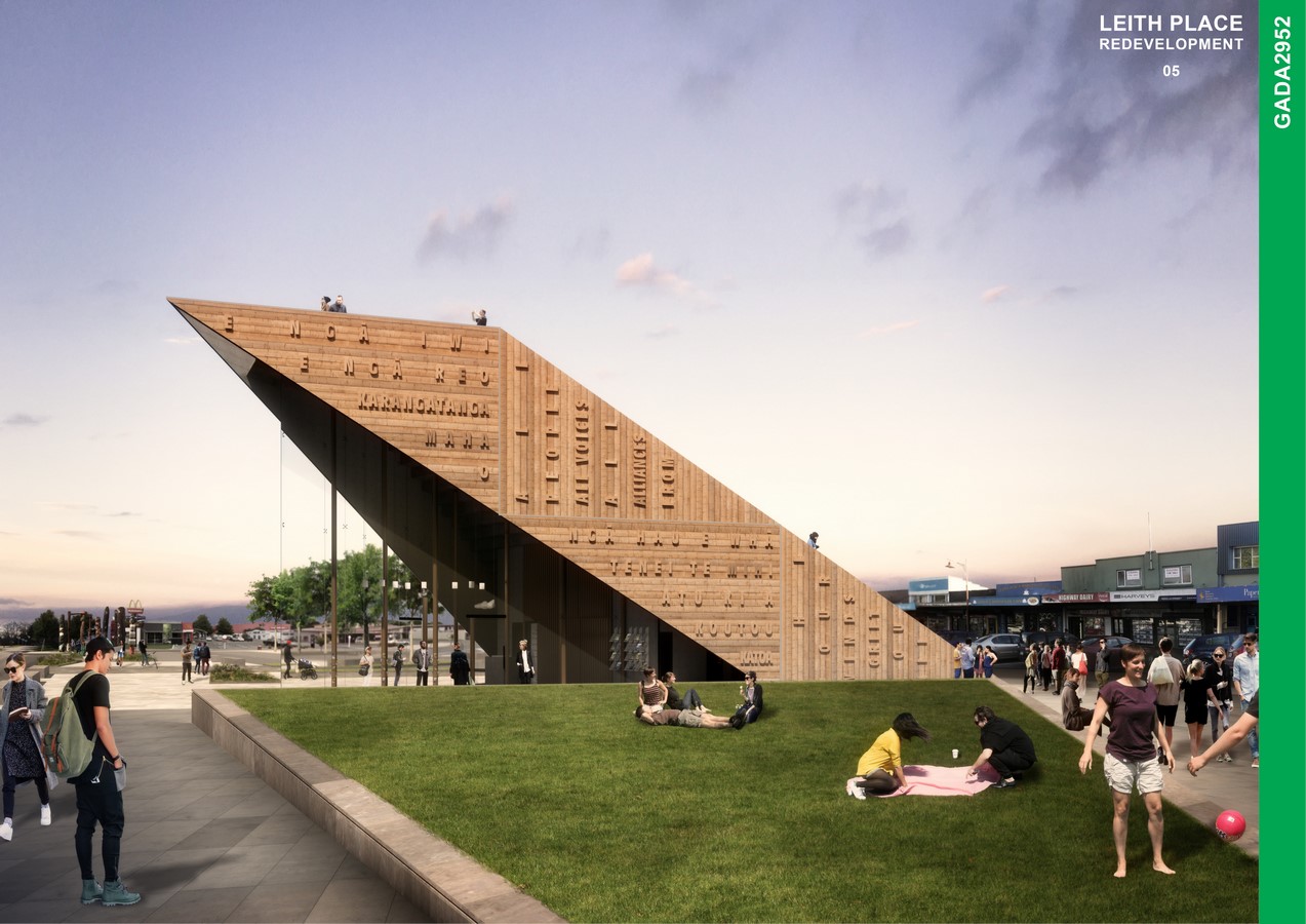 Our solution is to activate the long and narrow site. We decided to create activation points located on the northern and southern ends of Leith Place. These would be the beacons to catch the interest of motorists and allow time to turn off from State Highway 1.