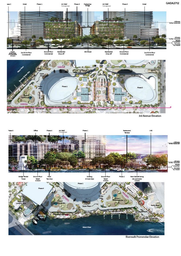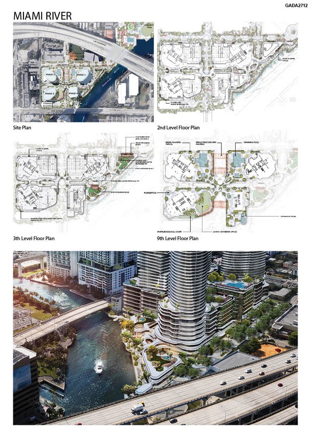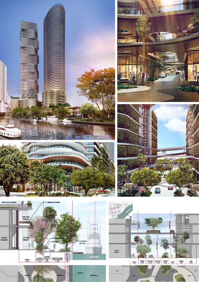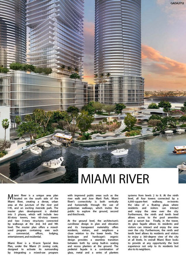 Miami River is a unique area plan located on the south side of the Miami River, creating a dense, urban area at the juncture of the river and I-95, and an exciting riverside park. The master plan development is divided into 5 phases, which will include two 85-story towers, two 60-story towers and two 3-story structures connected by walkways at the 2nd, 3rd and 9th level. The master plan offers a mixed-used program containing uses such as commercial, offices, lodging, entertainment, and residential.