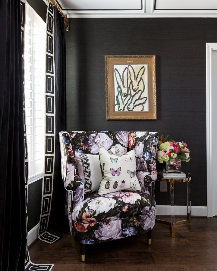 The black on black backgrounds with the layering on textures was brought to life by the bold use of color and pattern mix. It creates a moody look that expands the 14×17 bedroom.