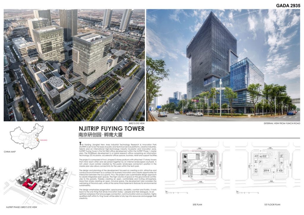 The Nanjing Jiangbei New Area Industrial Technology Research & Innovation Park (NJITRIP) is set to be the base of public and technical service platforms, creative industries, talents and an international high-technology industry incubator and innovation zone. NJITRIP Fuying Tower is the first R&D office development within the NJITRIP Phase 1 master plan. The 90,000sqm development is a hybrid research office comprising an information technology (IT) incubator, accelerator offices spaces, business, retail and support facilities.