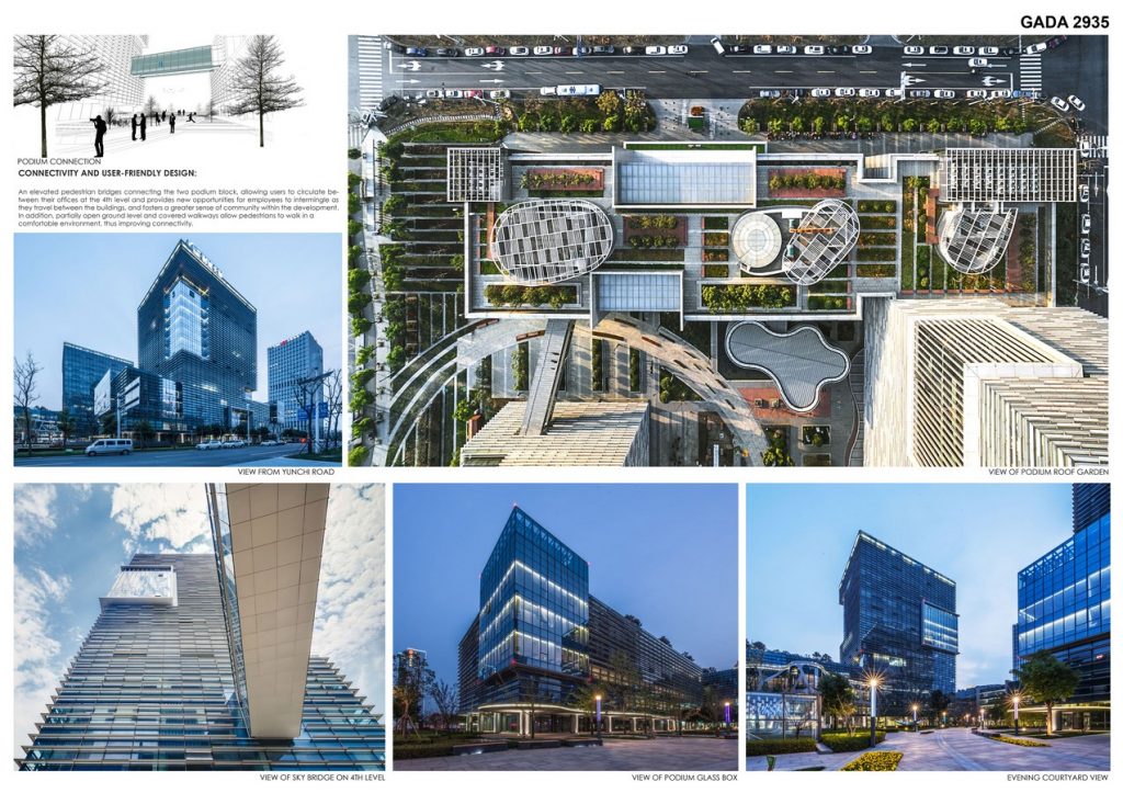 The project is composed of two L-shaped 5-storey podiums with attached 17-storey towers that mirror each other and are joined together by an internal landscaped courtyard. A rich urban visual corridor created by the public landscape connector’s position in the master plan also allows connectivity for the users within the tech park.