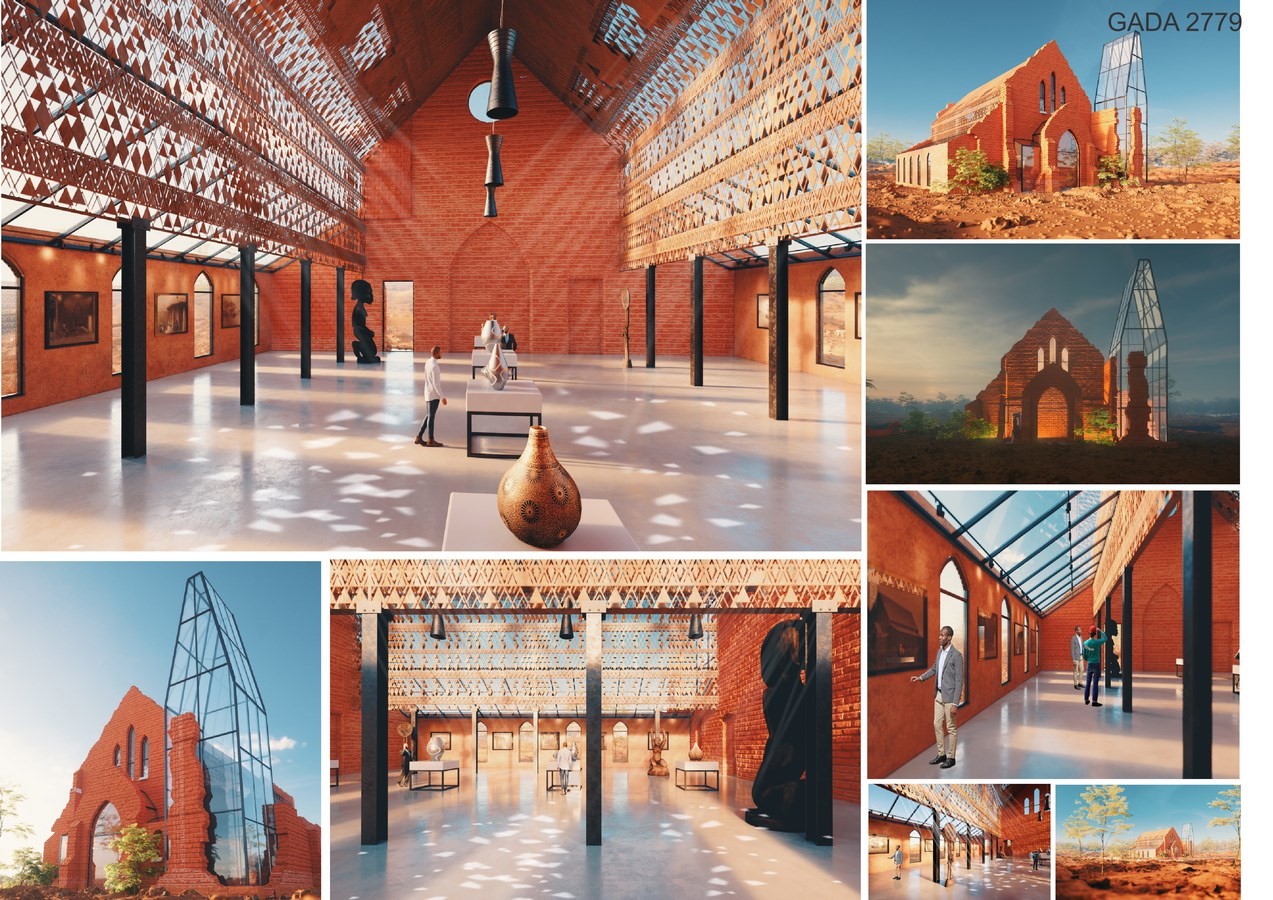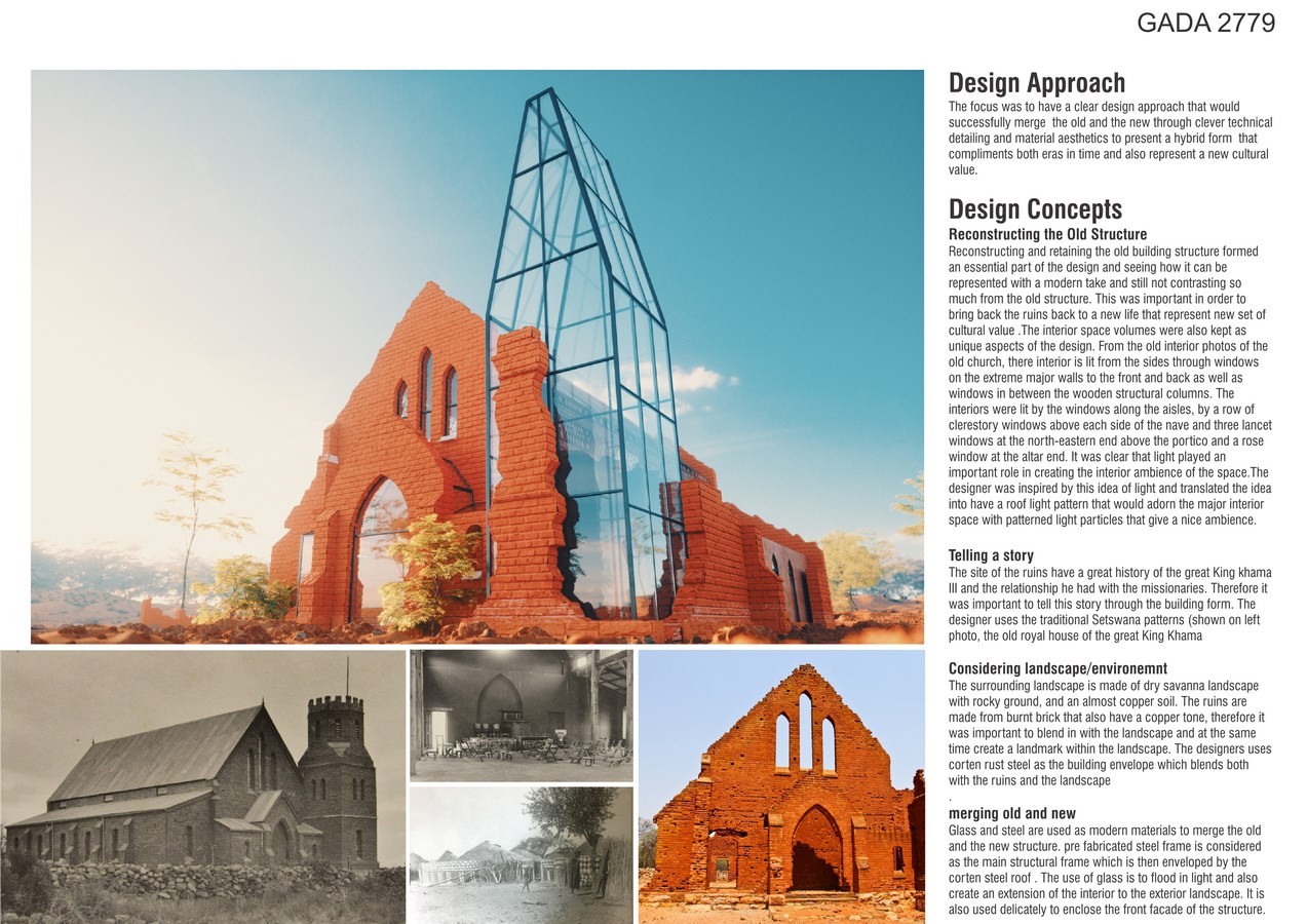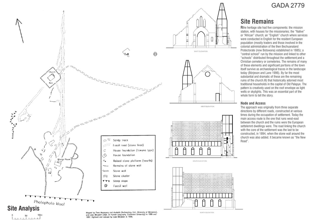 The design considered keeping the ruins in their original state, therefore a structural steel framework was introduced to rebuilt the old structure of the church by referring to its old photos. The height, form, windows of the old church were reconstructed with modern materials –corten steel to represent the hue of the burnt brick ruins and for the wall enclosure, steel for the structural frame and metal roofing. The metal roofing is patterned with the traditional pattern of the old royal house/homestead. It is often reflective of the Tswana traditional pattern used to adorn the traditional walls and houses.