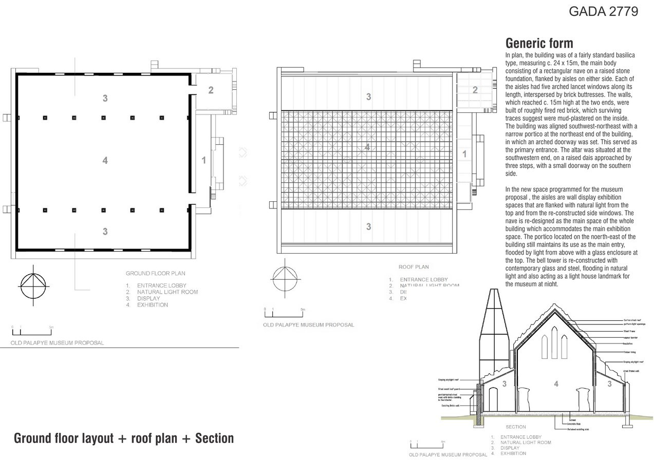 The pattern cutouts reflect light into the interior (previous church nave of the old church) of the museum and give a great ambience to the exhibition display. The two opposite spaces of the nave/exhibition space form the old church aisles, which now form the historic information display of the museum. The overall shape of the museum is the form of the old church in a contemporary state, with new added values and function. Therefore the imagery and history of the church and its historic site are brought back into life.