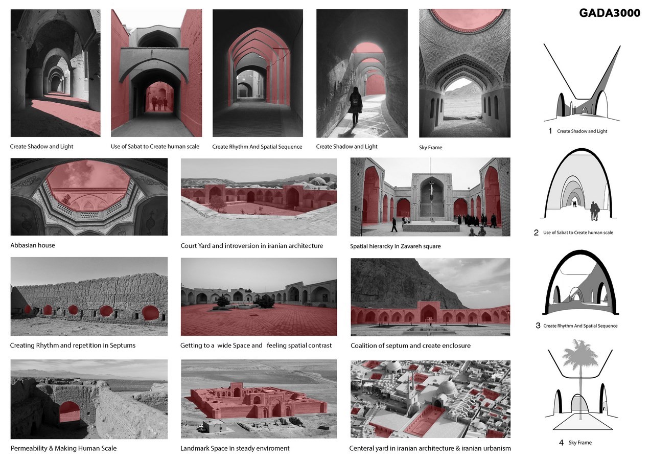 3-Attention to spatial contrast by designing heterogeneous spaces in different scales that emphasize on sense of being in space (texture of Iranian cities such as Yazd, Esfahan, Kashan, etc.)