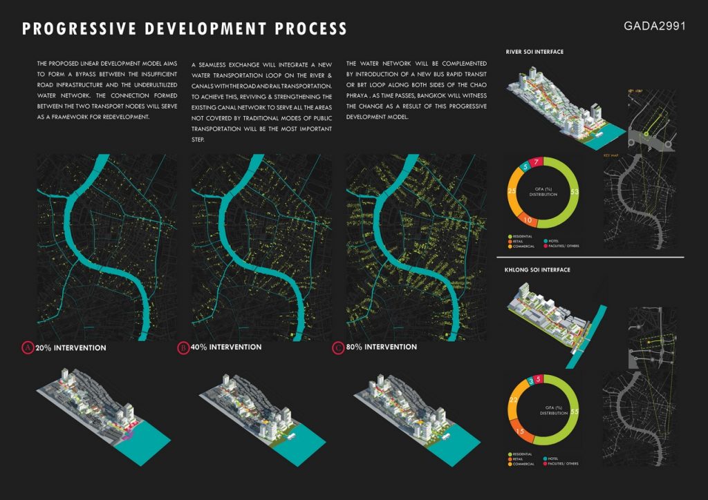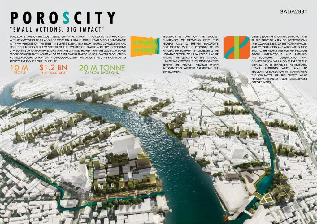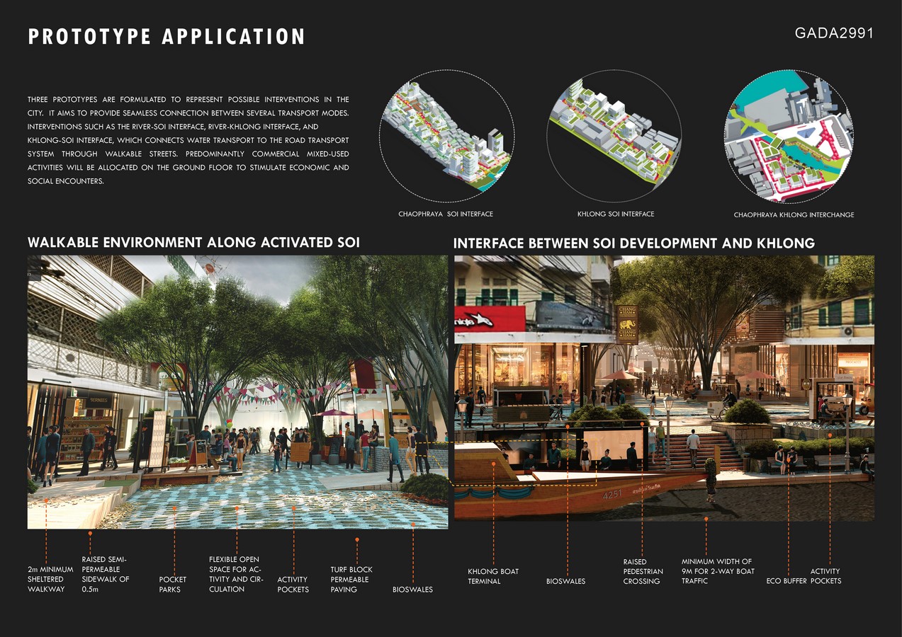 ‘Poroscity’ adheres to this very concept – which seamlessly meshes people, their activities & their natural environment. This proposal discusses ideas and concepts which involve soft, step by step measures to mitigate the effects of flood at a community level, thereby elevating people’s quality of life. A range of urban design guidelines will transform the ‘sois’ (alleys) into pedestrian friendly thoroughfares fostering public interactions & economic activities. Likewise, Green ‘Khlong’ (Canal) edges can passively help reduce the impacts of floods.