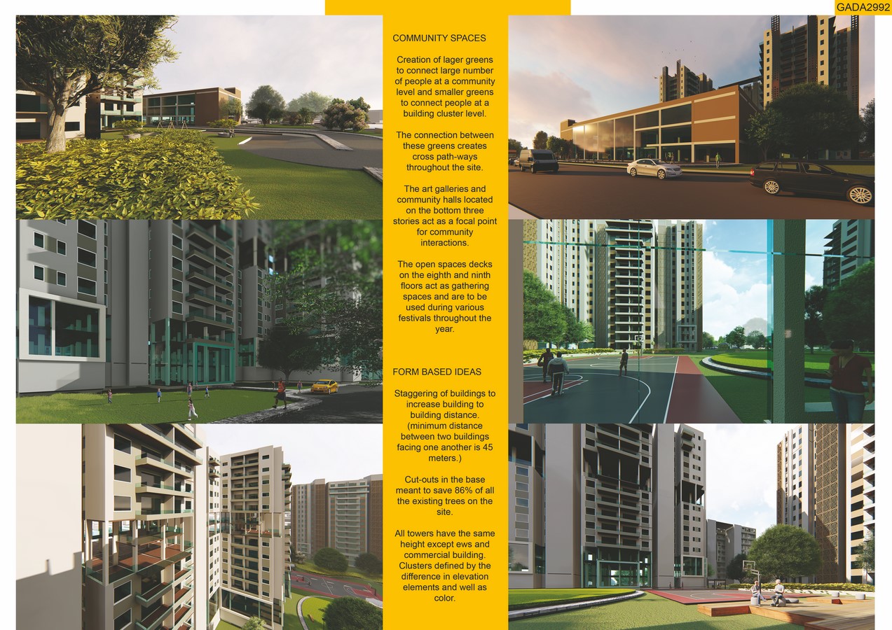 Creation of lager greens to connect large number of people at a community level and smaller greens to connect people at a building cluster level. The connection between these greens creates cross path-ways throughout the site.