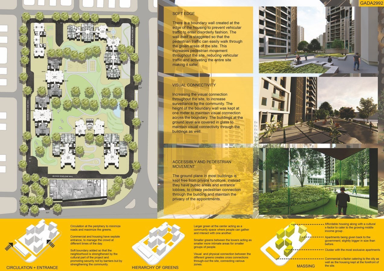 In the fear of making areas unsafe we as a society have started putting barriers all around ourselves, creating segregation between communities and people. This reduces trust and safety while increasing intolerance and conflicts in the community. In the housing we see gated communities with height boundary walls and a single point of access, this in turn reduces the connectivity, isolated us from the community. The idea for this housing project is to increase safety by connecting people and strengthening the community.