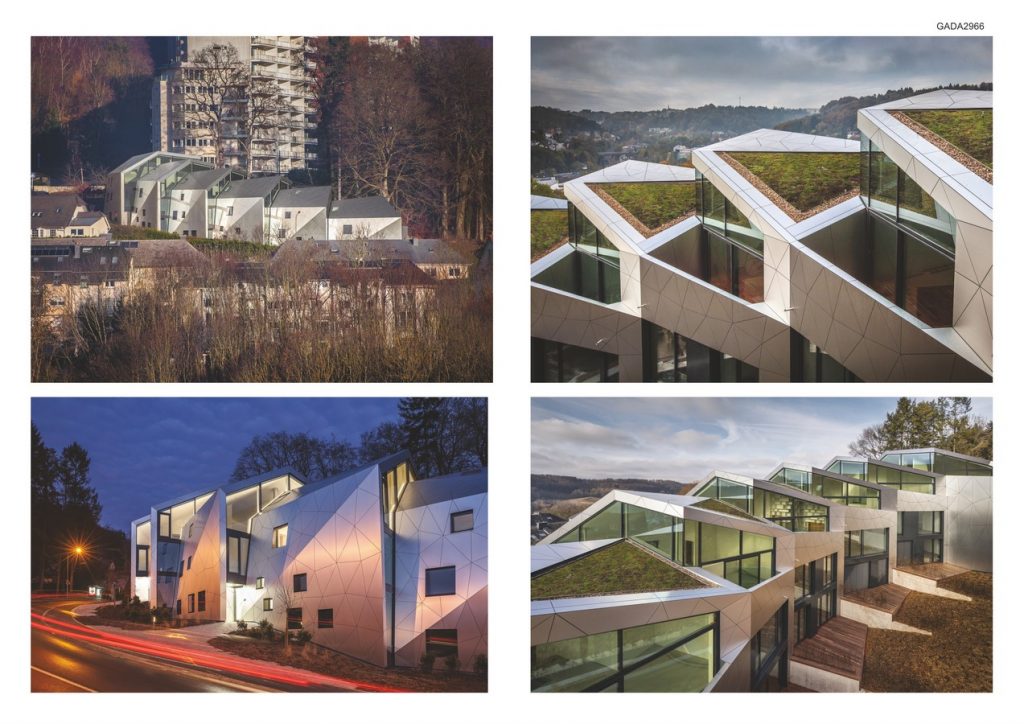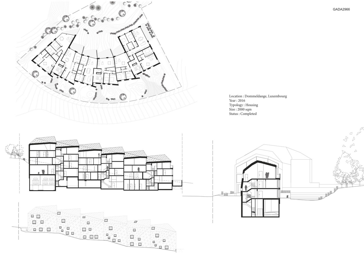 - The plot is situated along a particularly curved street, a very steep topography with 10 meters of difference in height and a preservation of three-century-old trees, classified as national monuments – all of these conditioned the initial shape of the building. Furthermore, the building responds to the specific urban context (small-scaled housing units on one side and large-scale apartment block on the other): it creates a subtle transition by splitting the main volume into six smaller, vertically shifted blocks. In this way, the building is adjusting to its surroundings; it preserves the required density, while nurturing the feeling of belonging, identity, human scale.