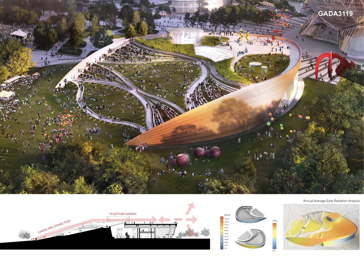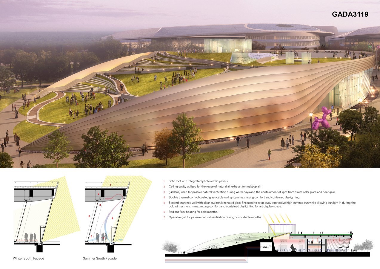 Inspired by the gently rolling hills of Kazakhstan, the design complements various sizes and scales of art, while also incorporating a double-wall system that insulates the building during the region’s humid summers and harsh winters. The shape was optimized to reduce energy and carbon loads, while incorporating passive design philosophies. An extensive solar radiation analysis was done to locate the optimal location for a series of rooftop photovoltaic panels, which determined that the exterior wall needed to be tilted downward to minimize solar radiation. A daylighting analysis helped determine the shape and the size of the atrium skylight and the density of the solar cells integrated into the skylight glass. A green roof further activates the sustainable qualities of the design. The roof thermally and acoustically insulates the museum as it creates multiple viewpoints and gathering points for visitors.