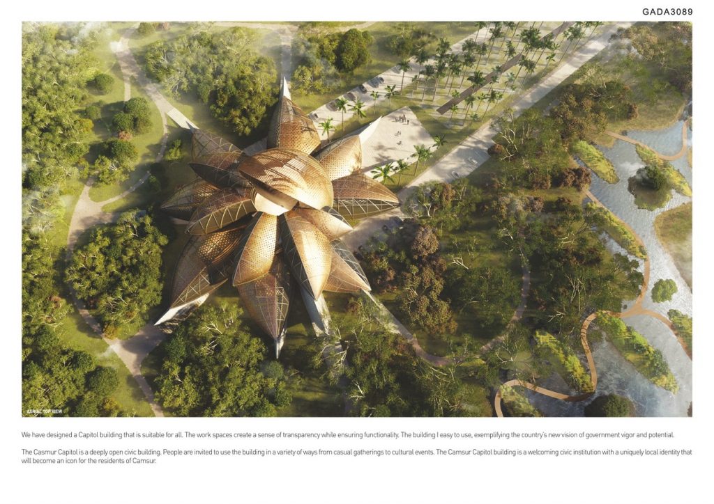 Our goal is to design a Capitol building that represents the identity and culture of Camarines Sur. The Camsur Capitol embodies a deep connection between the region’s landscape and its people. The design of the Capitol is a spiraling assembly of Pili-shaped-husks that appears like a mountain from the horizon and a flower from the sky.