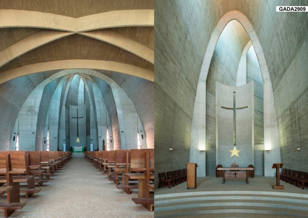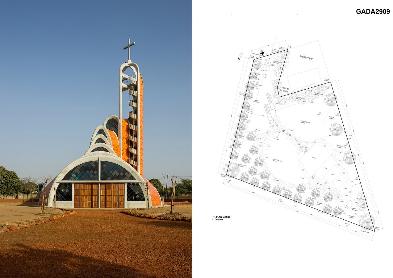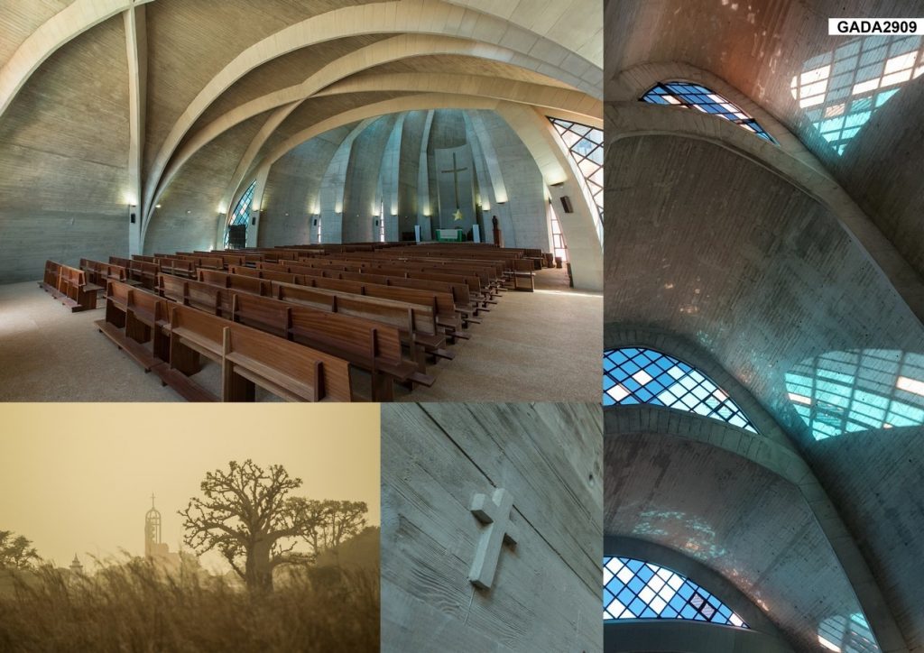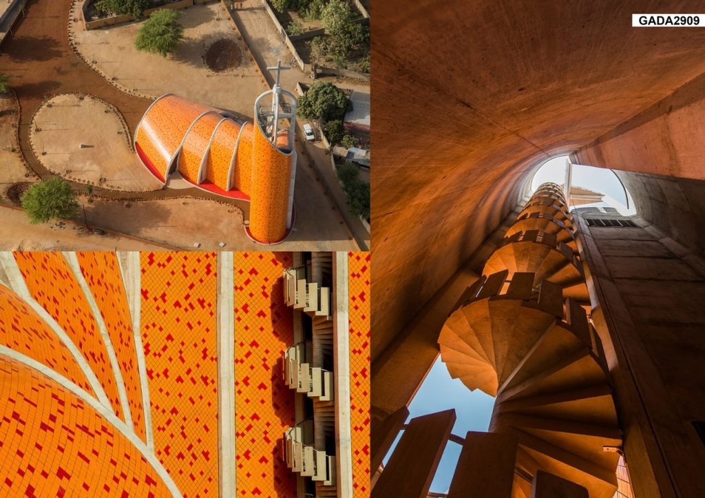 The building closes in the North, to protect itself from the hot and dry winds of the Harmattan, and opens towards the West to welcome the cooling trade winds from the sea. The bell tower functions as a veritable “wind tower” that uses natural convection to bring the trade winds into the building and to create natural ventilation.