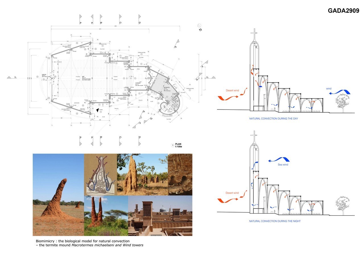 In order to put in place an effective passive ventilation, the project is inspired by the functioning of the African termite mound which is an extremely ingenious model of thermal regulation. It is also inspired by the functioning of wind towers in East Africa, which have also been known for centuries for their effectiveness. This crossed approach lays the foundations of a biomimetic approach.