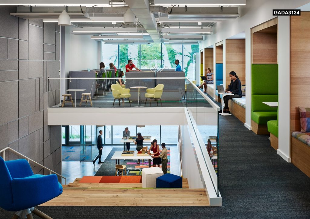 Inside, new high-performance HVAC and lighting systems reduce the building’s total energy use by over 50% compared to typical office buildings, while the rainwater from the cistern eliminates the need for municipal water for restrooms or landscape irrigation. Additionally, wellness and “restoration rooms” are available for employee relaxation and meditation. To ensure relevance well into the future, the design is easily adaptable and changeable, including movable furniture, flexible seating, and of course, modular flooring. The completed project will earn LEED Platinum and WELL Gold Certification.
