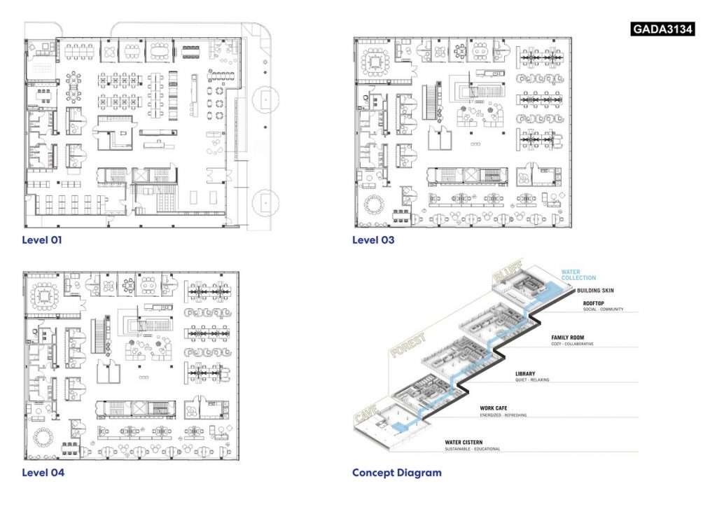 Building on Interface’s leadership in sustainability, this design looked to nature for inspiration. It incorporates Biophilic design as a key focus throughout, ensuring that occupants have a clear connection to the natural world, through the conceptual metaphors of a Cave, a Forest and a Bluff. Sited on a natural rocky ridge in the city, the lowest “Cave” levels house the refurbished parking garage, provide electric-vehicle charging and bicycle storage and showcase a 15,000-gallon rainwater cistern. The “Forest” comprises the three floors of existing office structure, each with a unique feel and destination. The “Bluff” consists of the new penthouse featuring the Learning Center, Roof Terrace and green roof where employees enjoy a natural respite with remarkable views. Horizontal and vertical circulation is organized as a continuous journey throughout the building. Along this path are myriad work-choice offerings that also function as product vignettes for Interface, decentralizing the traditional idea of a showroom. Employees are free to work from any location or type of furnishings that best support their tasks or mood.