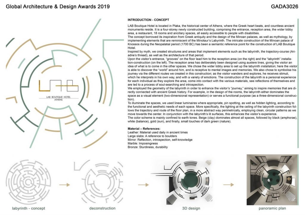 The concept borrowed its inspiration from Greek antiquity and the design of the Minoan palaces, as well as mythology, by implementing elements that are reminiscent of the Minotaur’s Labyrinth. The intricate construction of the Minoan palace of Knossos during the Neopalatial period (1700 BC) has been a semantic reference point for the construction of LAB Boutique Hotel.
