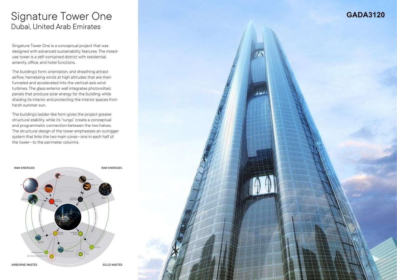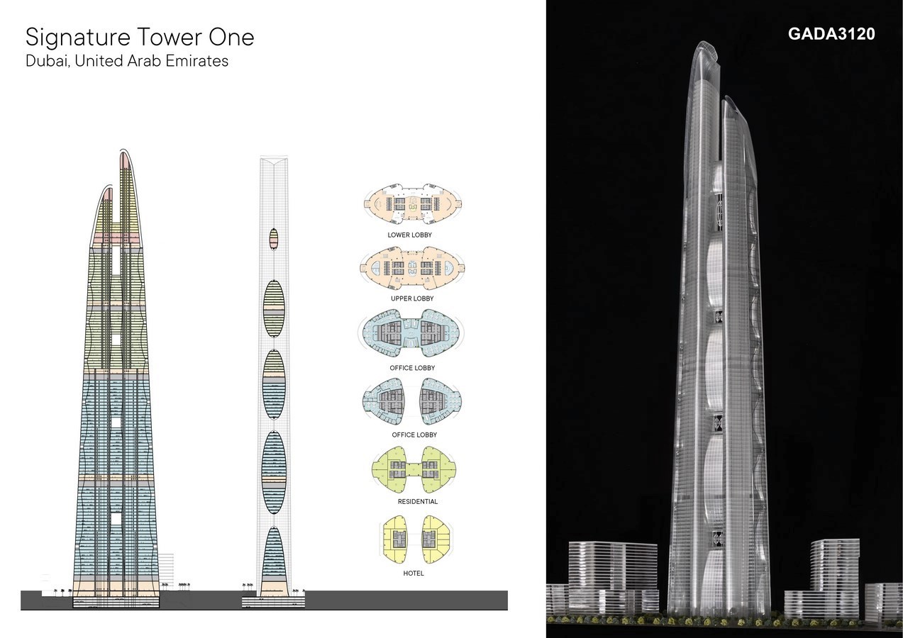 Signature Tower One is a conceptual project that was designed with advanced sustainability features for a new district in Dubai. The mixed-use tower is a self-contained city with residential, retail, amenity, office, and hotel functions.