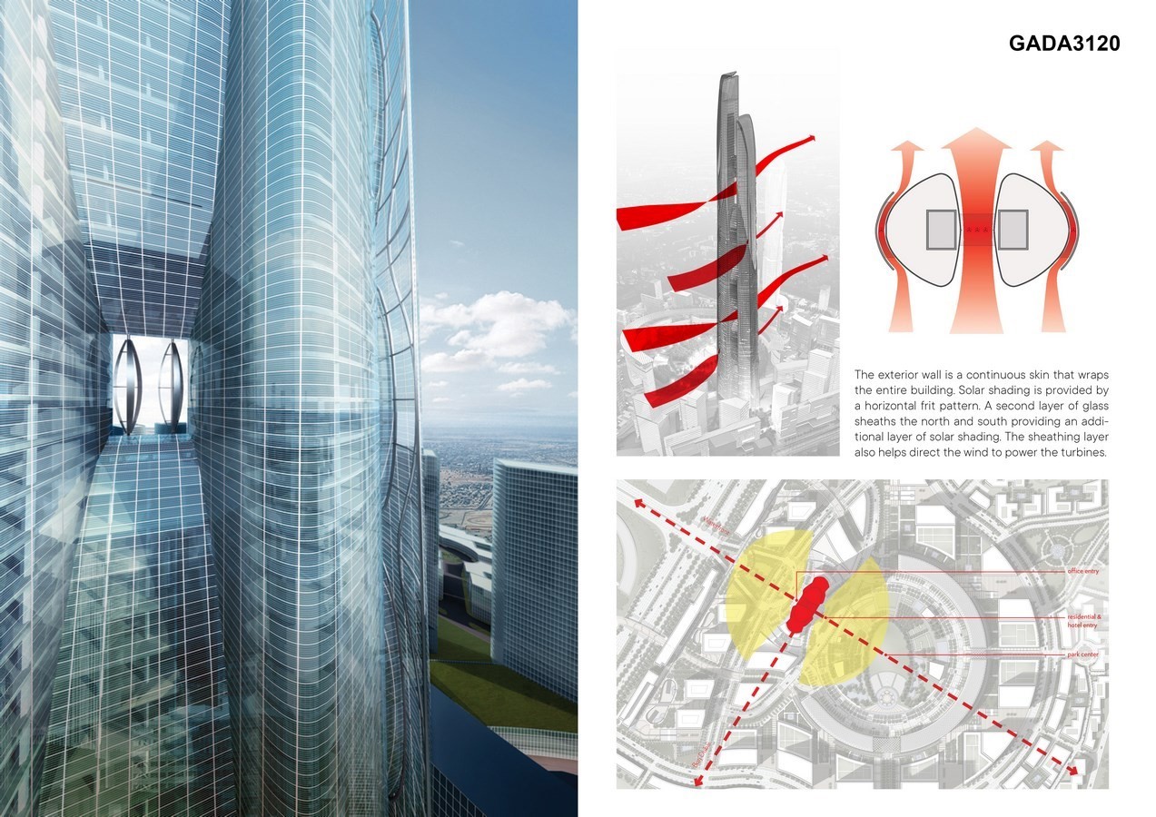 To achieve the building’s design goals, it’s form, orientation, and sheathing attract airflow, harnessing winds that are funneled and accelerated into vertical-axis wind turbines. The glass exterior wall integrates photovoltaic panels that produce solar energy for the building, while shading its interior and protecting the interior spaces from harsh summer sun. A second layer of glass sheaths the north and south providing an additional layer of solar shading. The sheathing layer also helps direct the wind to power the turbines.