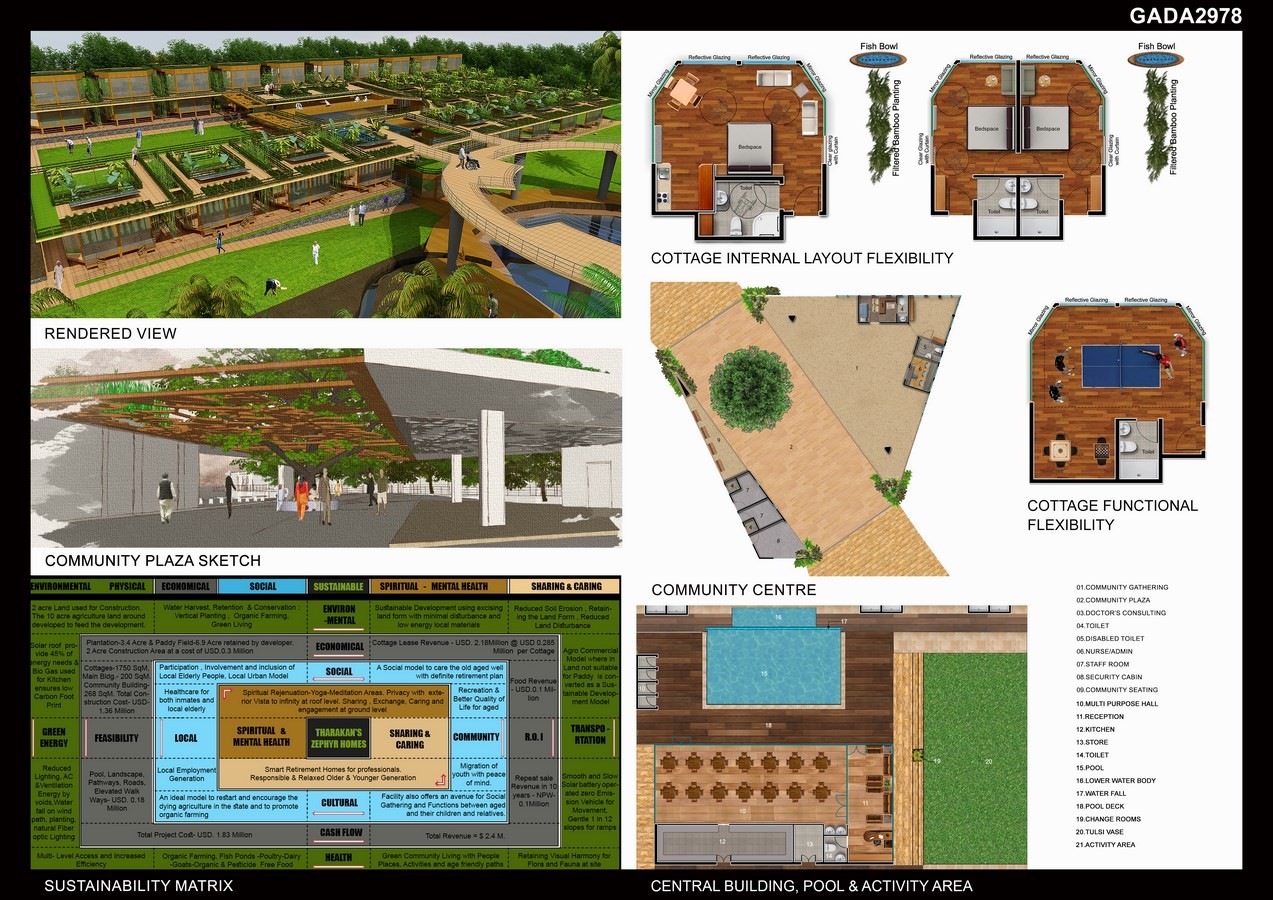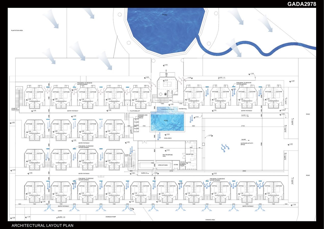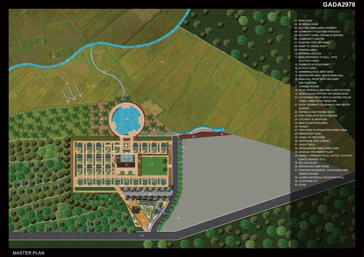 The project is visualized as a resort for such retired elderly, located in a Village 25 kms from Ernakulam. Designed in a land area of 8000 SqM the project consists of 66 cottages, central building, community centre, animal farms and other amenities with a total built up area of 2216 SqM.