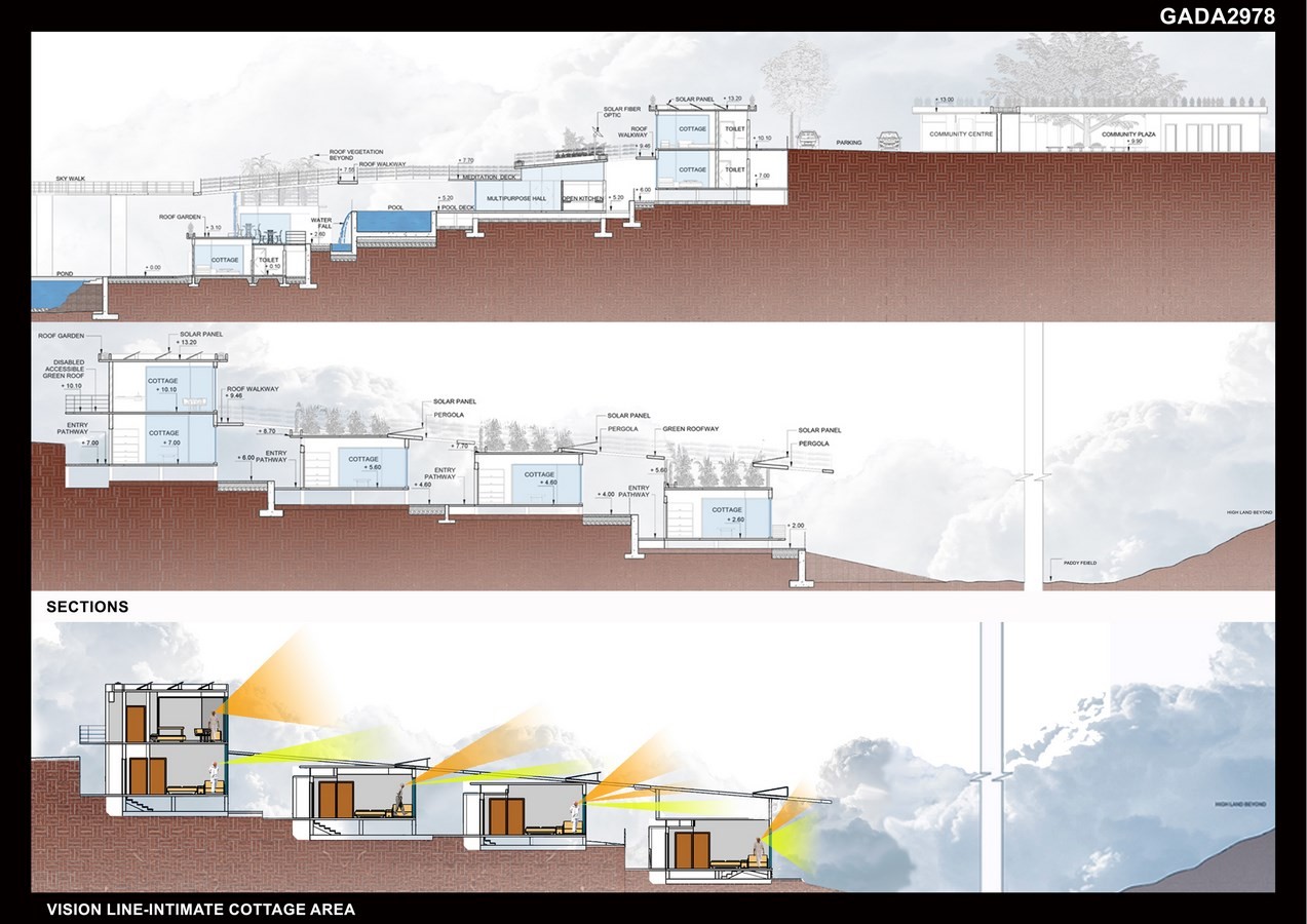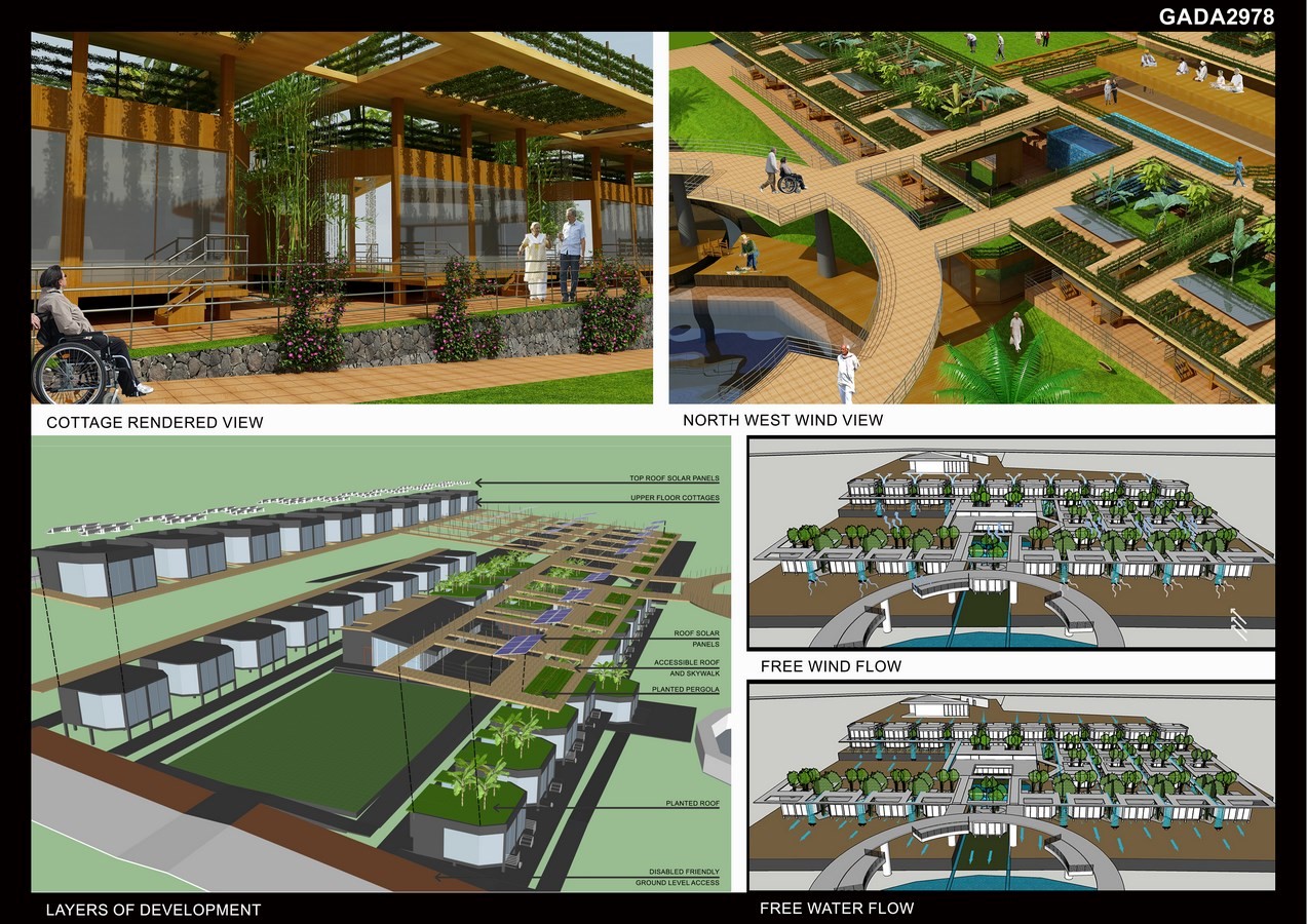 Roof of the development is designed to include a 1 in 12 walkway with vegetated pergolas, adjustable solar panels, meditation platform and fibre optic receivers. This roof walkway starts from community centre & continues seamlessly till the sky-walk. Chamfered cottages funnel zephyr through inter-spaces, while reflecting the surroundings- resulting in visual merger to landscape. Closeness of cottages provides safety and togetherness, whereas roof infinity views allow privacy and freedom- both essential during older ages.