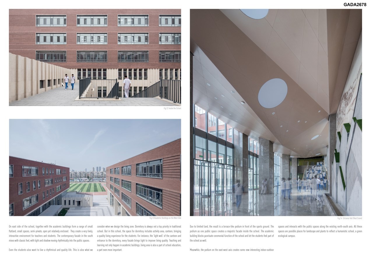 Academic buildings are clustered on the north side, separated by the canteen and gymnasium to filter out the traffic noise from the overhead bridge. Living area and gymnasium are on the south side to facilitate the gymnasium open to public. School History Hall, gymnasium and podium are open spaces to connect the entire campus for learning, sports and living.
