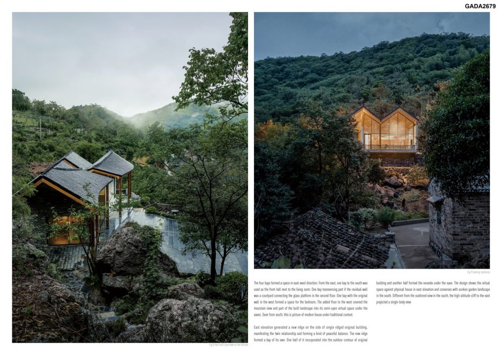Hence, as for the plan layout, we considered adding one span in the west to reach one side of the rocky mountain, and another span in the south-north to form a wider space of living room; the curves were partly brought in the plan so as to separate an alienated imaginary space from the original projection profile; we increased the existing building into two levels, combined with the extensive imaginary space, so that an alternating spatial curved surface was formed. The traditional folding roof and streamline combined into one, which reflects Taoist culture “the three begets all things of the world” in China; seen from the aerial view, the black-tile-covered roof in the ancient village is both accordant and outstanding, while features of the interior environment shows from the outside for the first time.