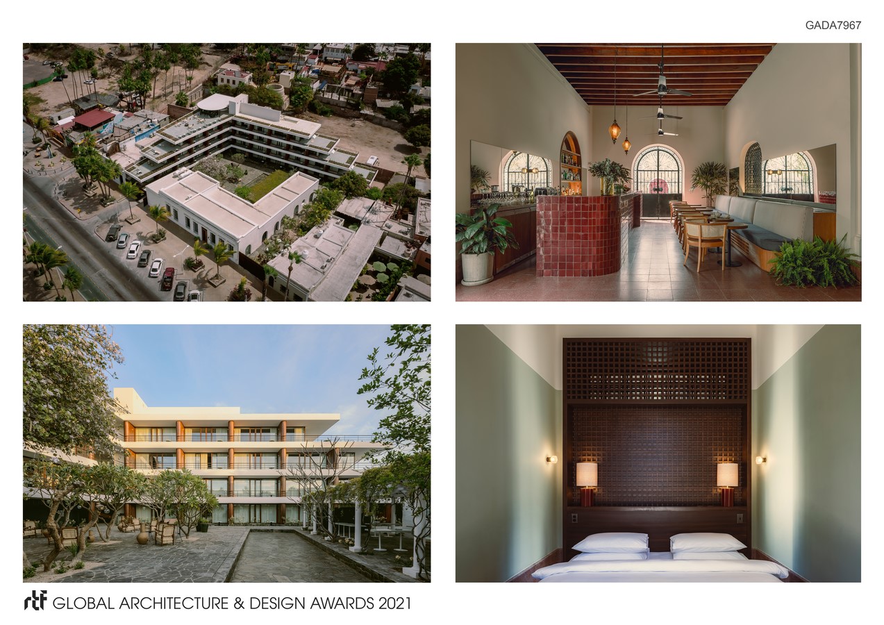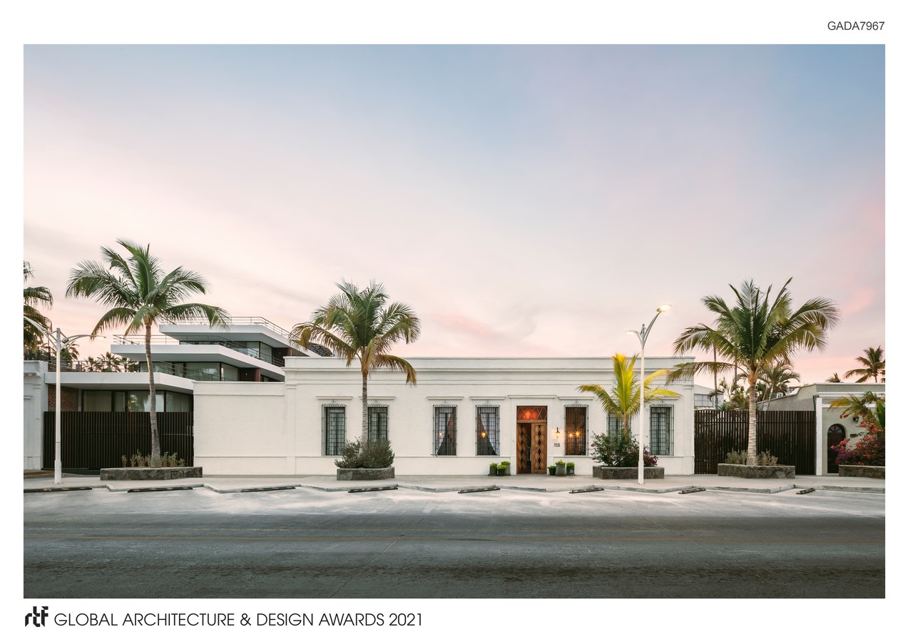 Baja Club entails a 32–room lifestyle hotel for hoteliers Grupo Habita located on a beautiful plot of coastal promenade in the historic centre of La Paz, Baja California Sur, Mexico. Blending old with new, the 3623 m2 project brings together the restoration and adaptive reuse of a pre–existing colonial–style villa dating from 1910 –once a site for oyster pearl harvesting– and the construction of a new four–story extension plus basement containing guestrooms, suites, a spa and a rooftop sunset bar.