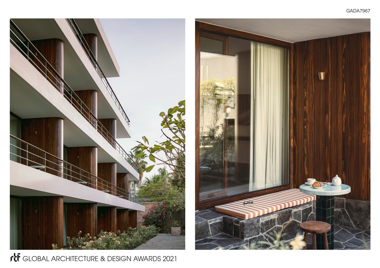 Guest–room corridors are also open–air, shaded by brise–soleil elements that promote cross ventilation. Passive design solutions were employed where possible. For instance, the newbuild’s cantilevered reinforced concrete floor plates serve as passive shading elements that vastly reduce solar heat gain to the interior spaces and minimize the dependence on mechanical air conditioning. Numerous water elements throughout the project cause evapotranspiration and thus refresh the outdoor spaces in La Paz’ hot and dry desert climate.