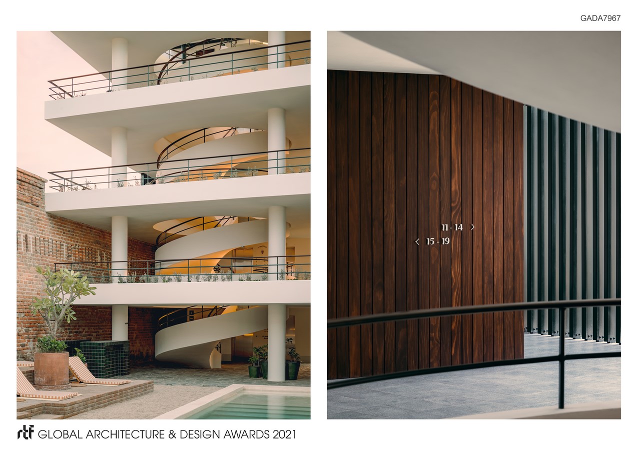Vertical circulation is resolved in form of a generous helical staircase positioned at the hinge point between the two wings of the new building. It’s an almost sculptural element and the centrepiece of the addition. Due to its comfortable tread to riser ratio, it sweeps visitors up to the upper guest room levels and the rooftop sunset bar with an ease that disincentivizes the use of the elevators which are located off of the same open–air lobby space.