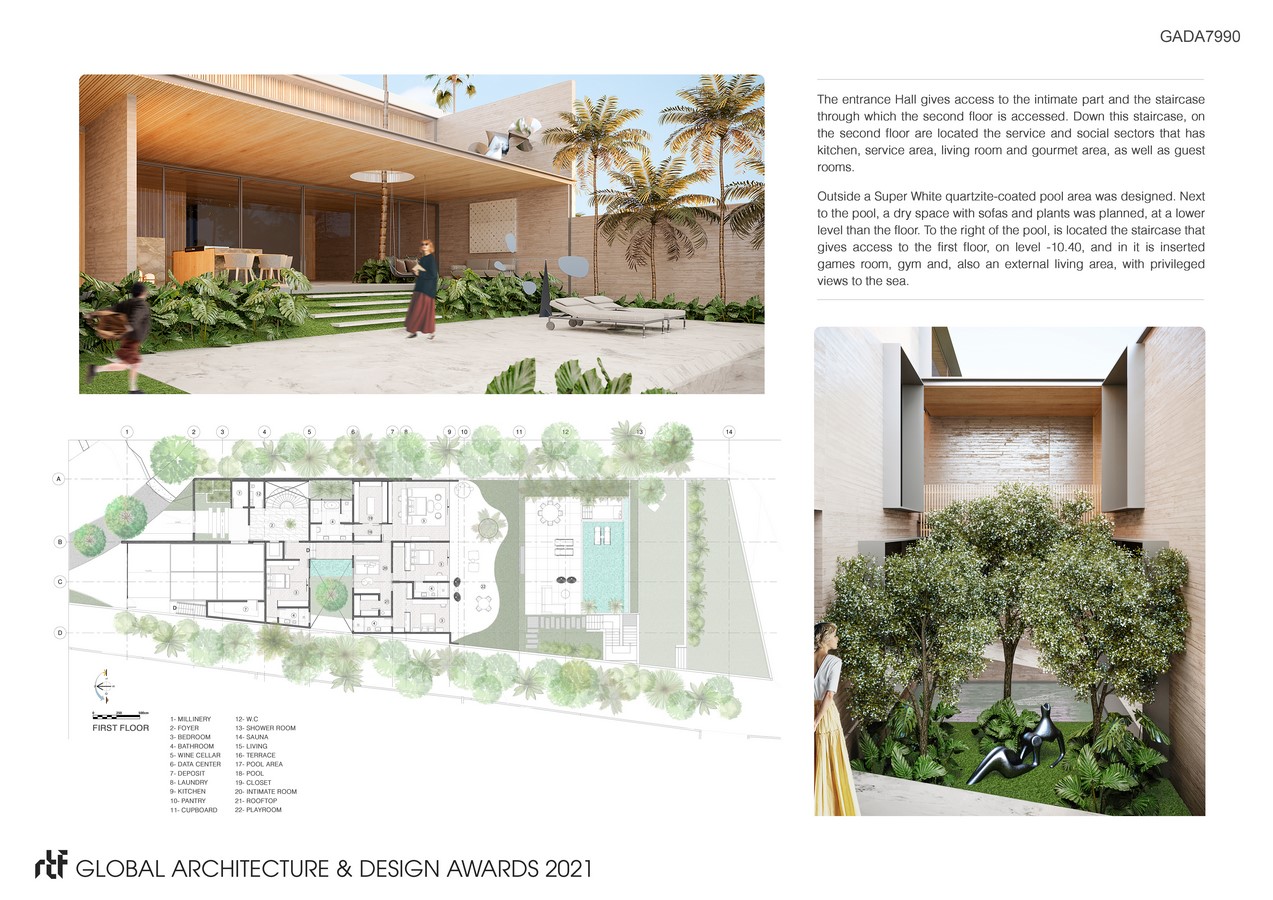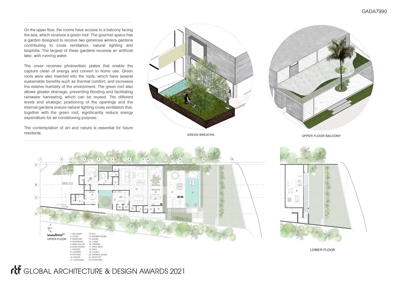 On the upper floor, the rooms have access to a balcony facing the sea, which receives a green roof. The gourmet space has a garden designed to receive two generous winters gardens contributing to cross ventilation, natural lighting and biophilia. The largest of these gardens receives an artificial lake, with running water.