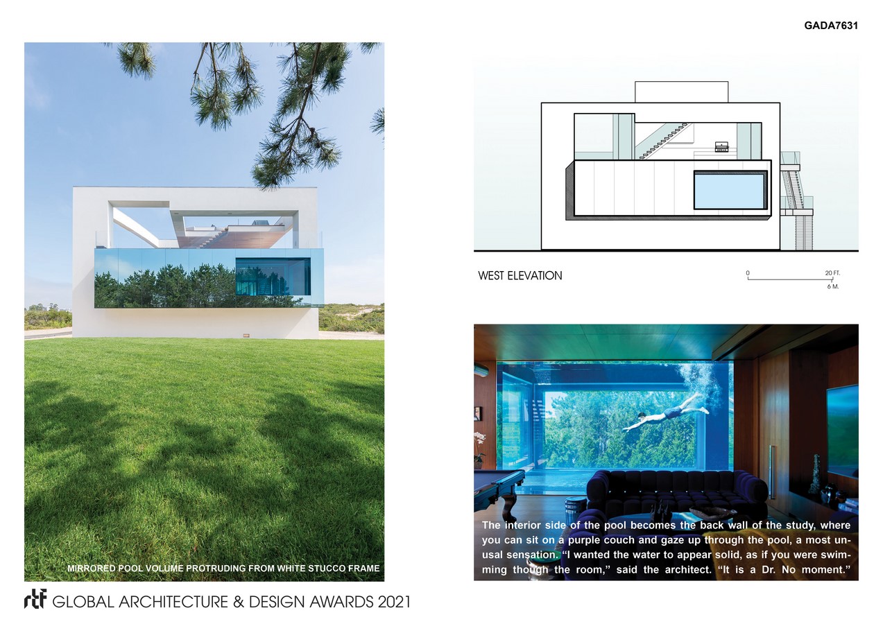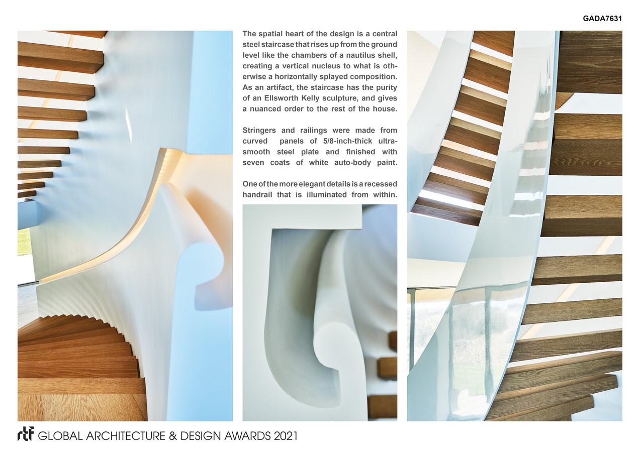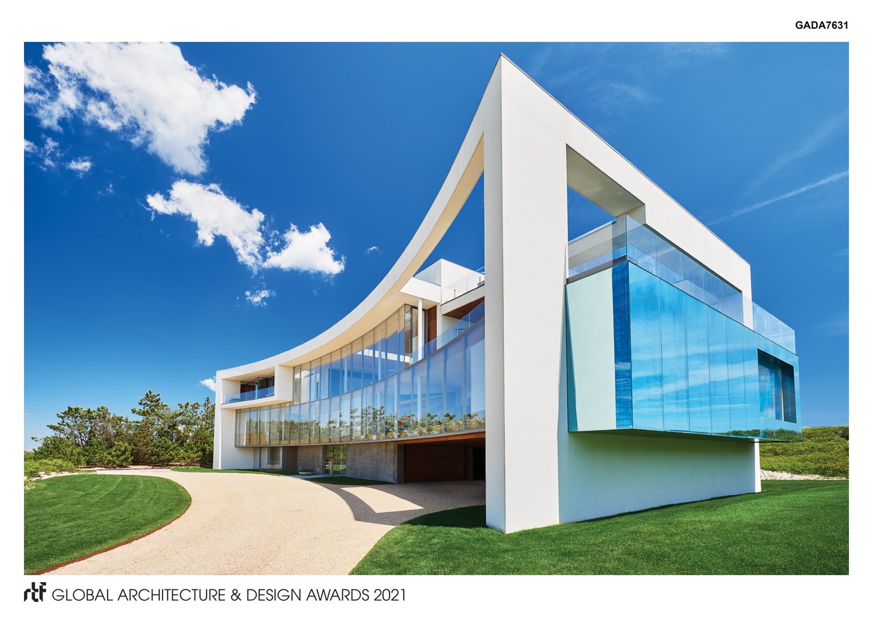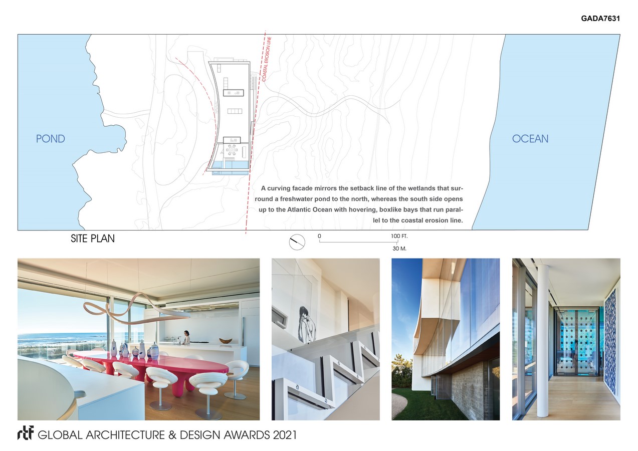 Standing sentinel on a narrow beach site flanked by the Atlantic Ocean and a large pond, the home has a form inspired by, and responsive to, its site constraints. To maximize views, the two long sides of the house that run parallel to the shores were designed as curtain-walls of glass while the two short sides are more solid to enforce down-beach privacy. The upper level, floating 42 feet above the ocean below, evokes the serenity of being at sea.