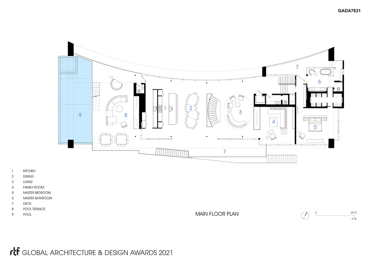 The form was further molded by flood zone regulations dictating that the first floor be raised above ground, while site regulations inspired a front façade elegantly curved, following a setback requirement. A parti was devised in which a super-frame allows for the programmatic spaces to be seemingly suspended above the ground and, per the clients’ request, the shared spaces and Master Suite were placed at the top. To maximize sight lines and take advantage of the site’s orientation, several floor plates were extruded to form balconies while the pool, accessed from the public upper level, was extruded and cantilevered from the side of the frame. Three sides of the pool are glass: the two parallel sides allowing light into the owners’ study and for views through the pool to the trees beyond while the third side allows for views out to the ocean.
