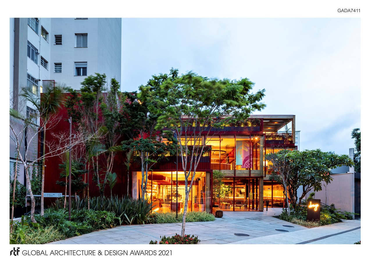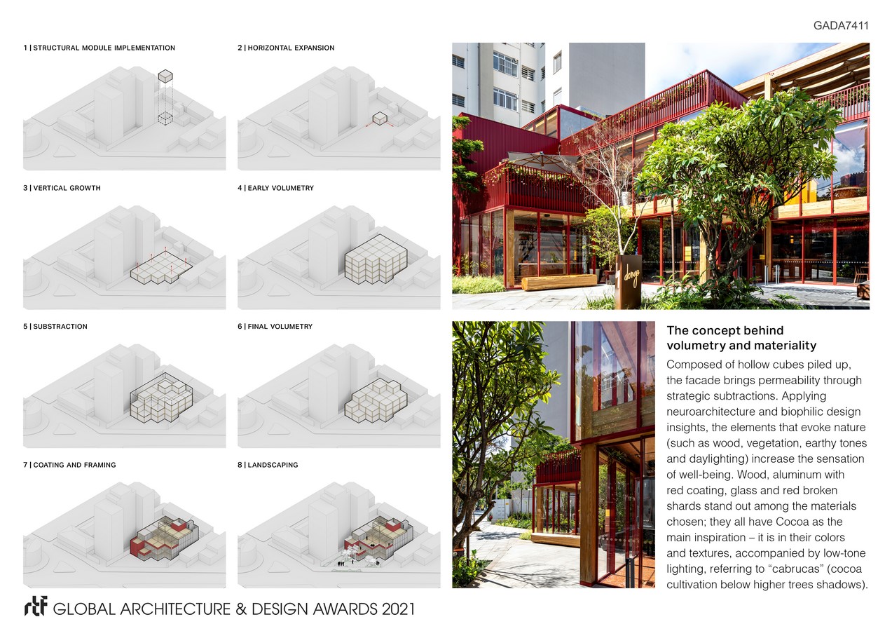 Composed of hollow cubes piled up, the facade brings permeability through strategic subtractions. Applying neuroarchitecture and biophilic design insights, elements that evoke nature (such as wood, vegetation, earthy tones, and daylighting) increase the sensation of well-being. Wooden surfaces, aluminum with red coating, glass and red broken shards stand out among the materials chosen; they all have Cocoa as the main inspiration – it is in their colors and textures, accompanied by low-tone lighting, referring to “cabrucas” (cocoa cultivation below higher trees shadows).