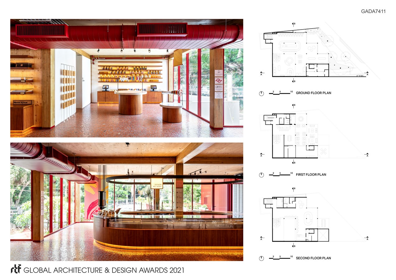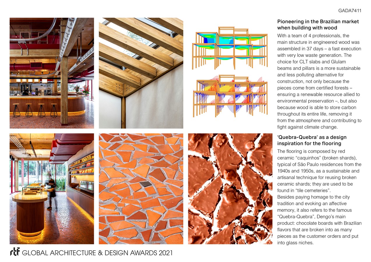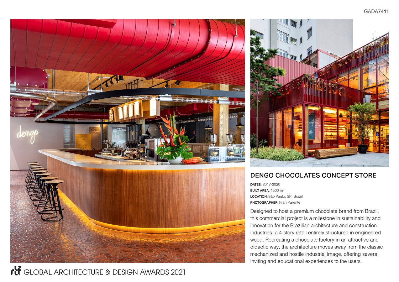 Designed to host the sales of a premium chocolate brand, Dengo Chocolates Concept Store is a milestone in sustainability and innovation for the Brazilian architecture and construction industries: a 4-story retail entirely structured in engineered wood. Recreating a chocolate factory in an attractive and didactic way, the architecture moves away from the classic mechanized and hostile industrial image, offering several inviting and educational experiences to the users.