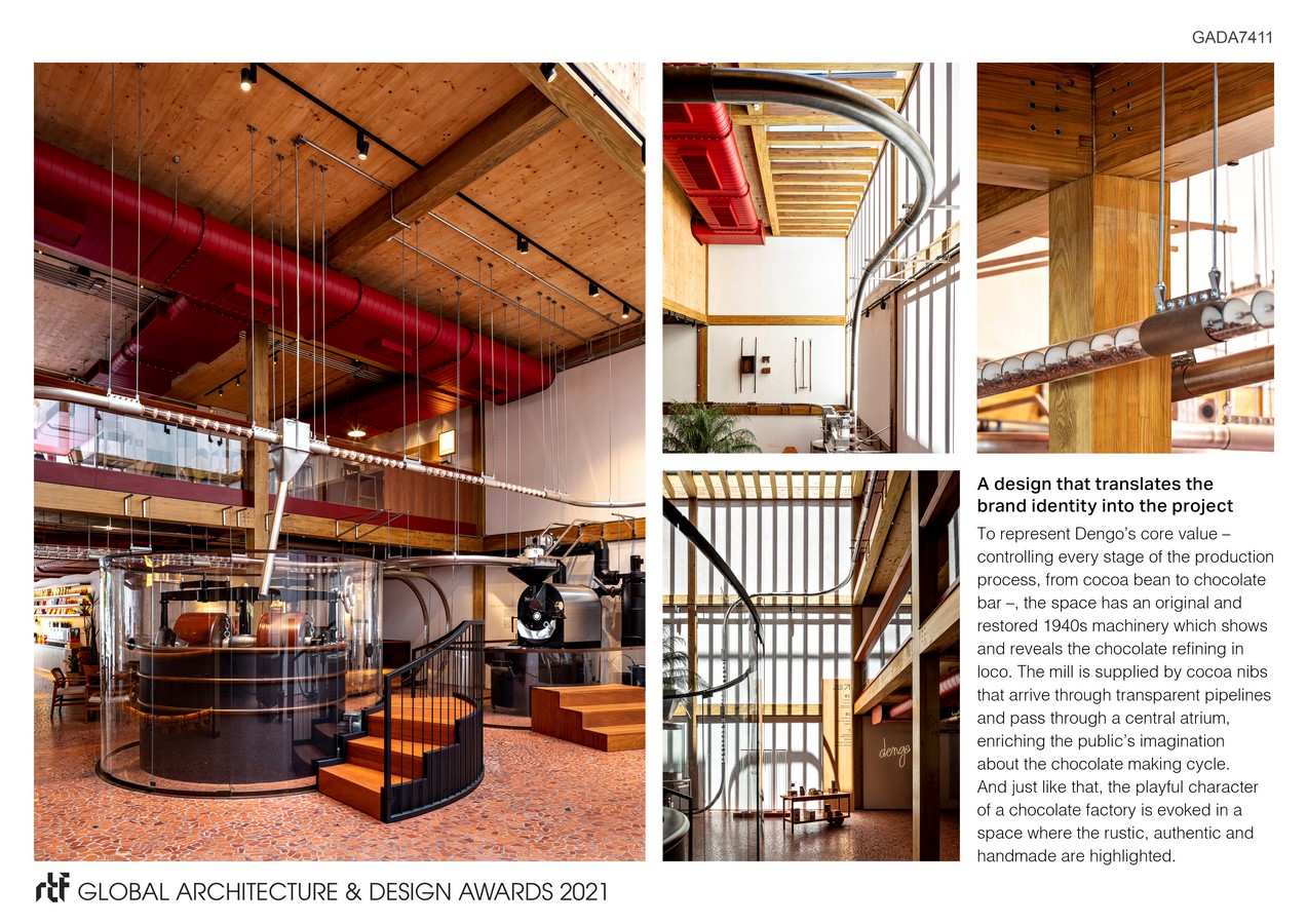 To represent Dengo’s core value – controlling every stage of the production process, from the production of cocoa beans in sustainable farms in Bahia to the making of the chocolate bar –, the space has an original and restored 1940s machinery which shows and reveals the chocolate refining in loco. The mill is supplied by cocoa nibs that arrive through transparent pipelines and pass through a central atrium, enriching the public’s imagination about the chocolate making cycle. And just like that, the playful character of a chocolate factory is evoked in a space where the rustic, authentic and handmade are highlighted.