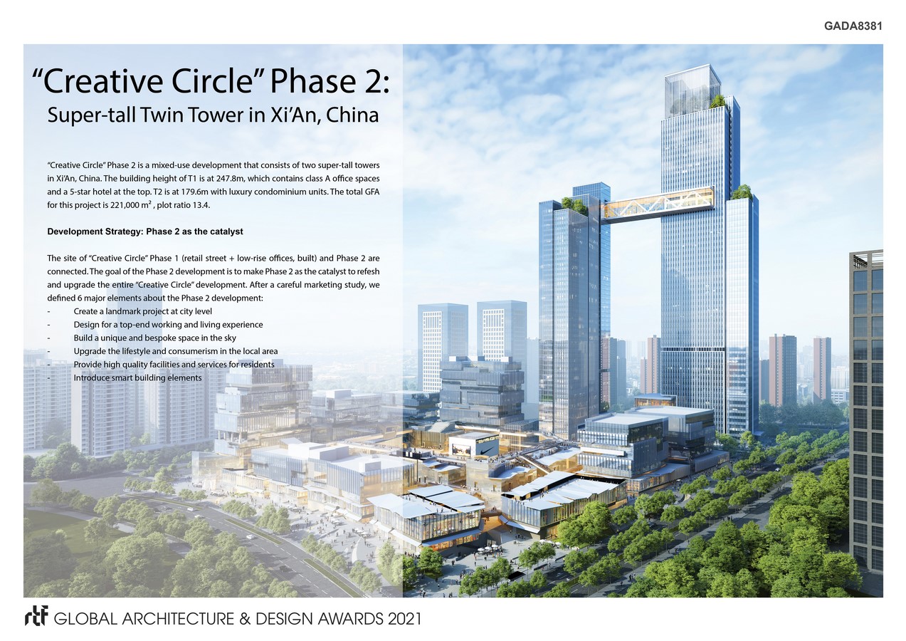 The site of “Creative Circle” Phase 1 (retail street + low-rise offices, built) and Phase 2 are connected. The goal of the Phase 2 development is to make Phase 2 as the catalyst to refesh and upgrade the entire “Creative Circle” development. After a careful marketing study, we defined 6 major elements about the Phase 2 development: