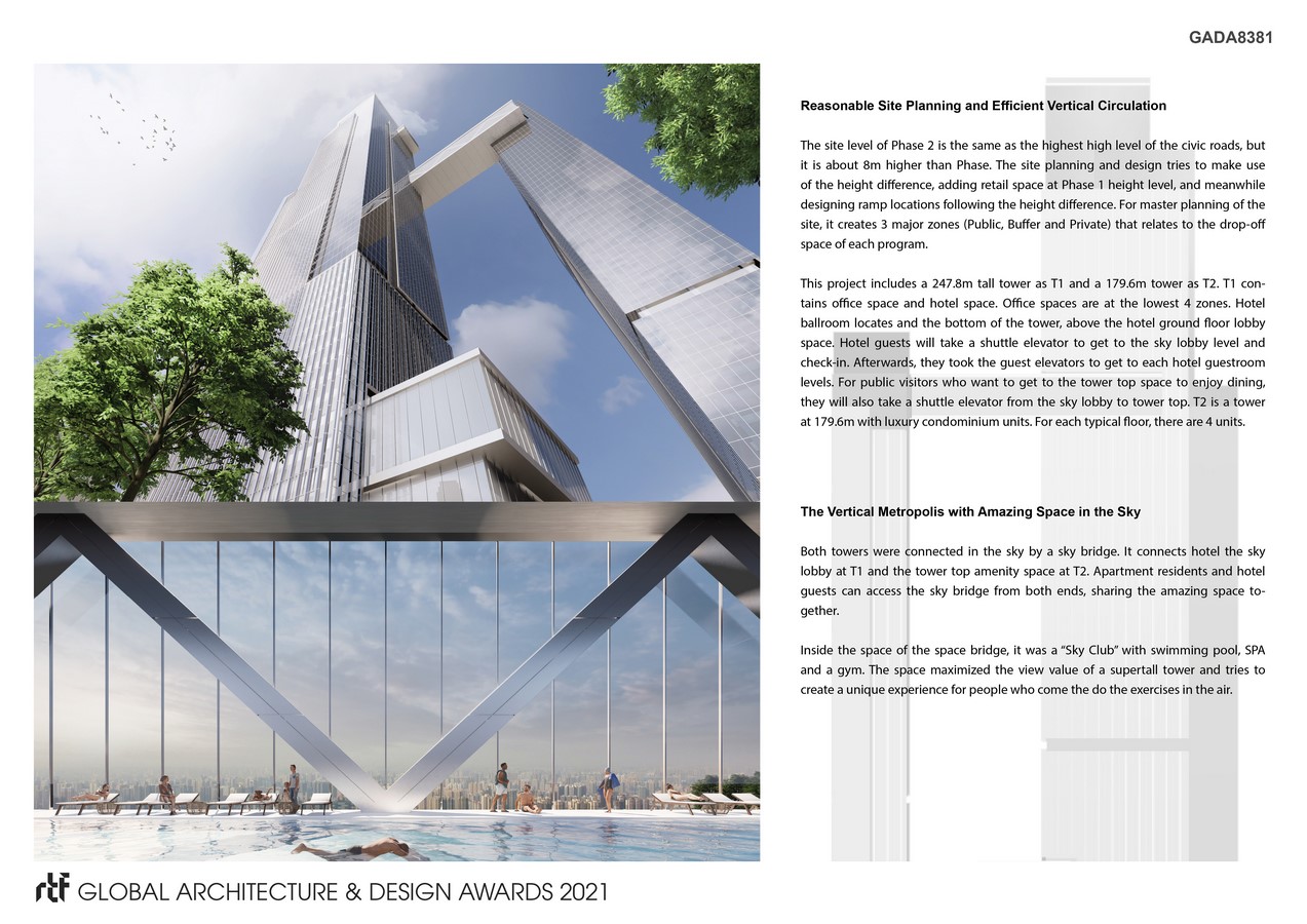 This project includes a 247.8m tall tower as T1 and a 179.6m tower as T2. T1 contains office space and hotel space. Office spaces are at the lowest 4 zones. Hotel ballroom locates and the bottom of the tower, above the hotel ground floor lobby space. Hotel guests will take a shuttle elevator to get to the sky lobby level and check-in. Afterwards, they took the guest elevators to get to each hotel guestroom levels. For public visitors who want to get to the tower top space to enjoy dining, they will also take a shuttle elevator from the sky lobby to tower top. T2 is a tower at 179.6m with luxury condominium units. For each typical floor, there are 4 units.